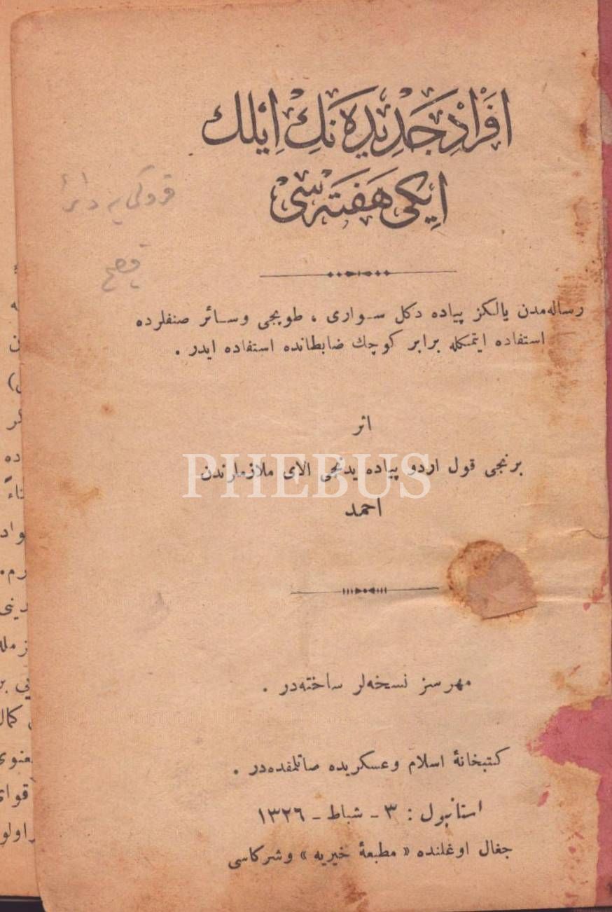 Askerî eğitime dair 8 eser tek ciltte: EFRÂD-I CEDÎDENİN İLK İKİ HAFTASI, Ahmed, Matbaa-i Hayriye ve Şürekası, İstanbul 1326, 42 s.; AL BAYRAĞIN DİLEĞİ- ATICILIK, M. Emin, Matbaa-i Hayriye ve Şürekası, İstanbul 1330, 42 s.;