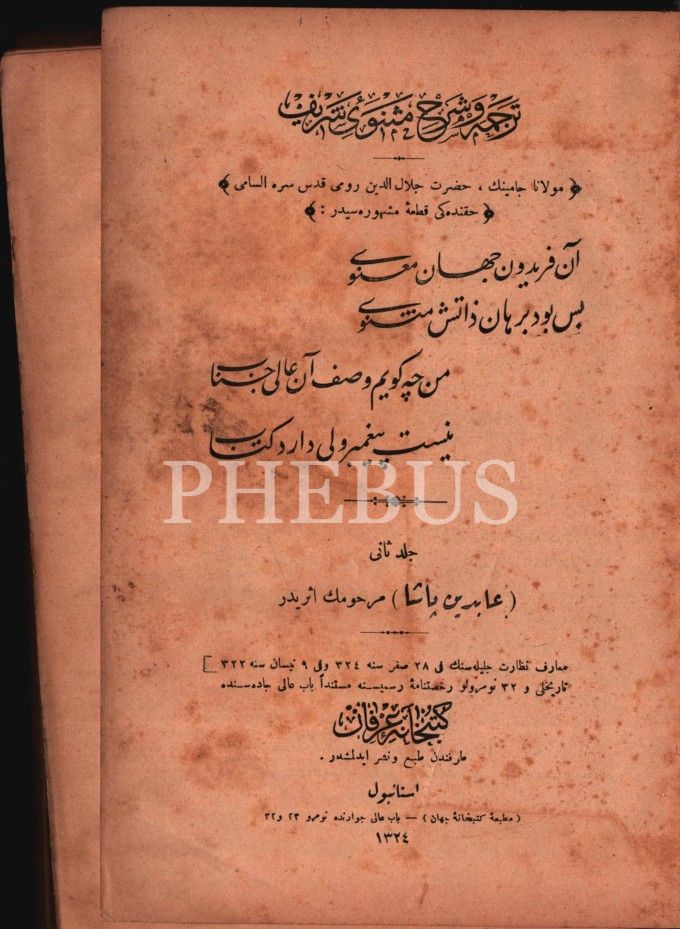 TERCÜME VE ŞERH-İ MESNEVÎ-İ ŞERÎF (2. Cilt), Abidin Paşa, Cihan Kütübhanesi Matbaası, İstanbul 1324, 296 s., 17x25 cm