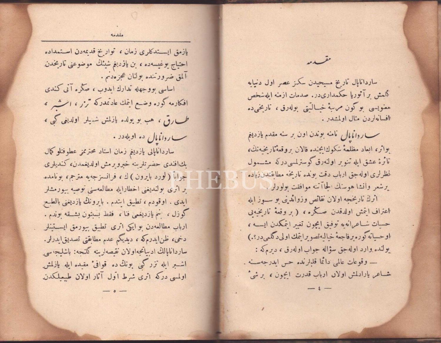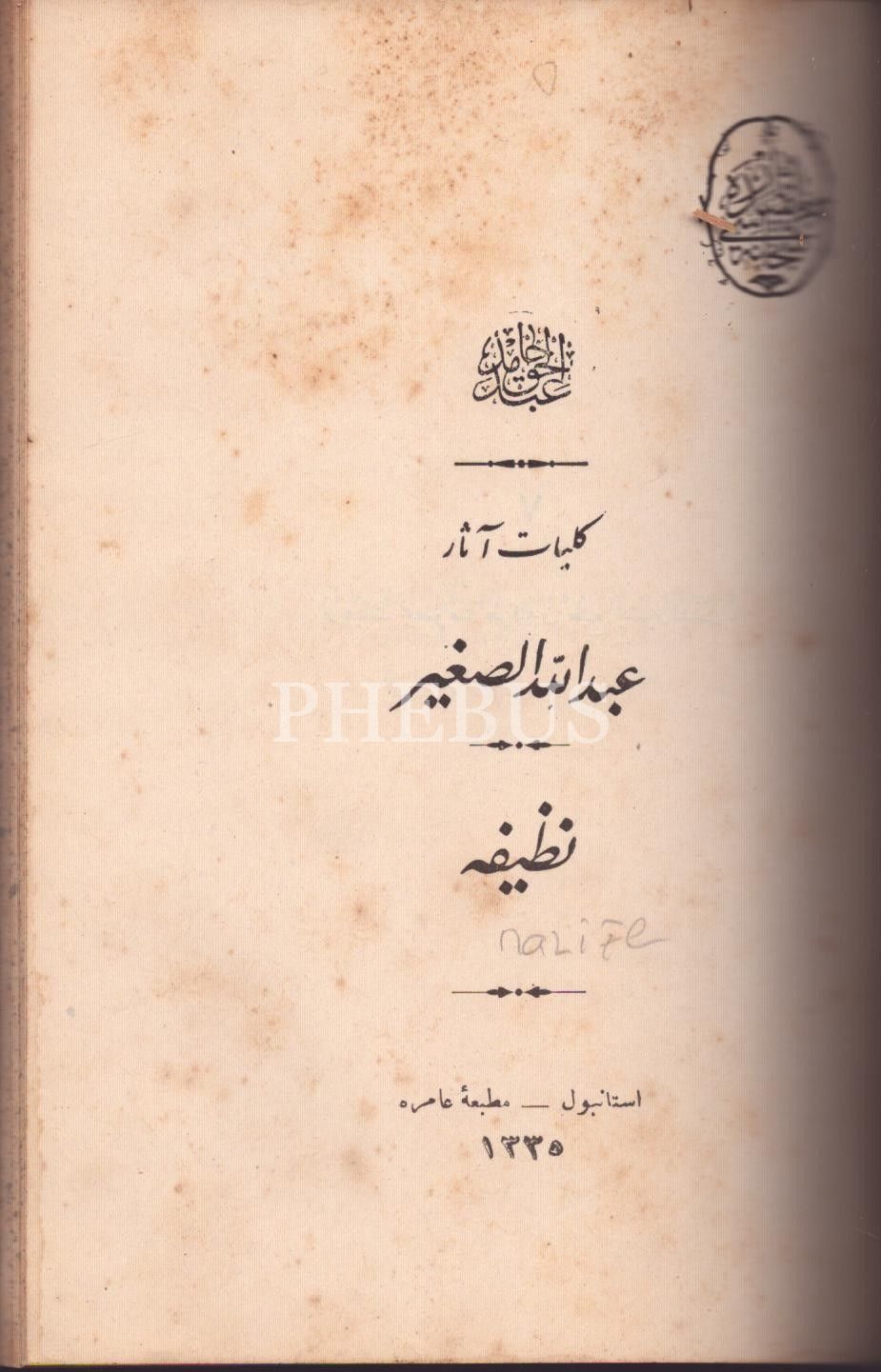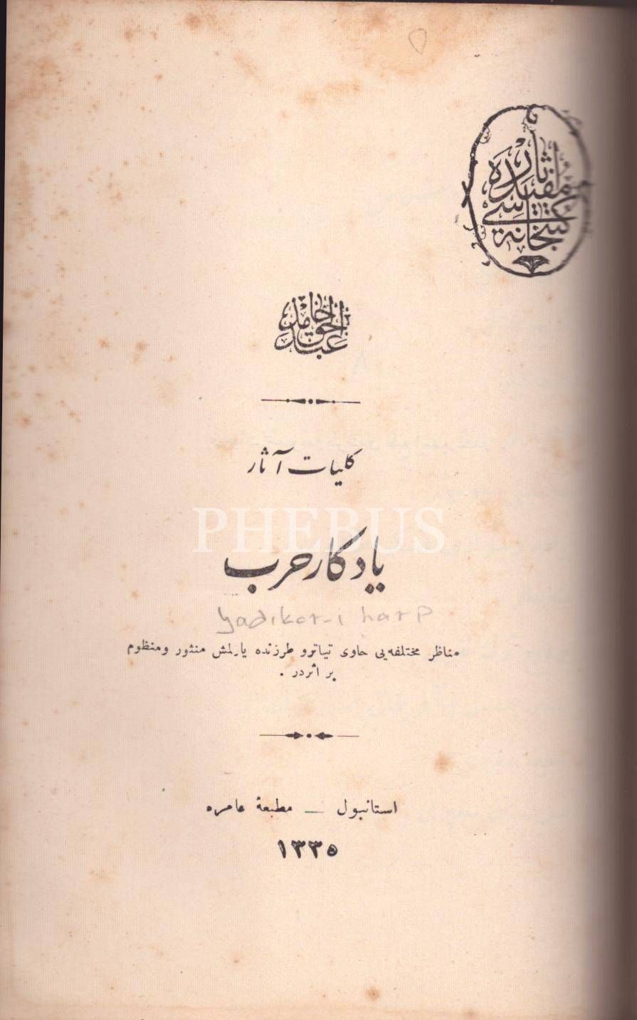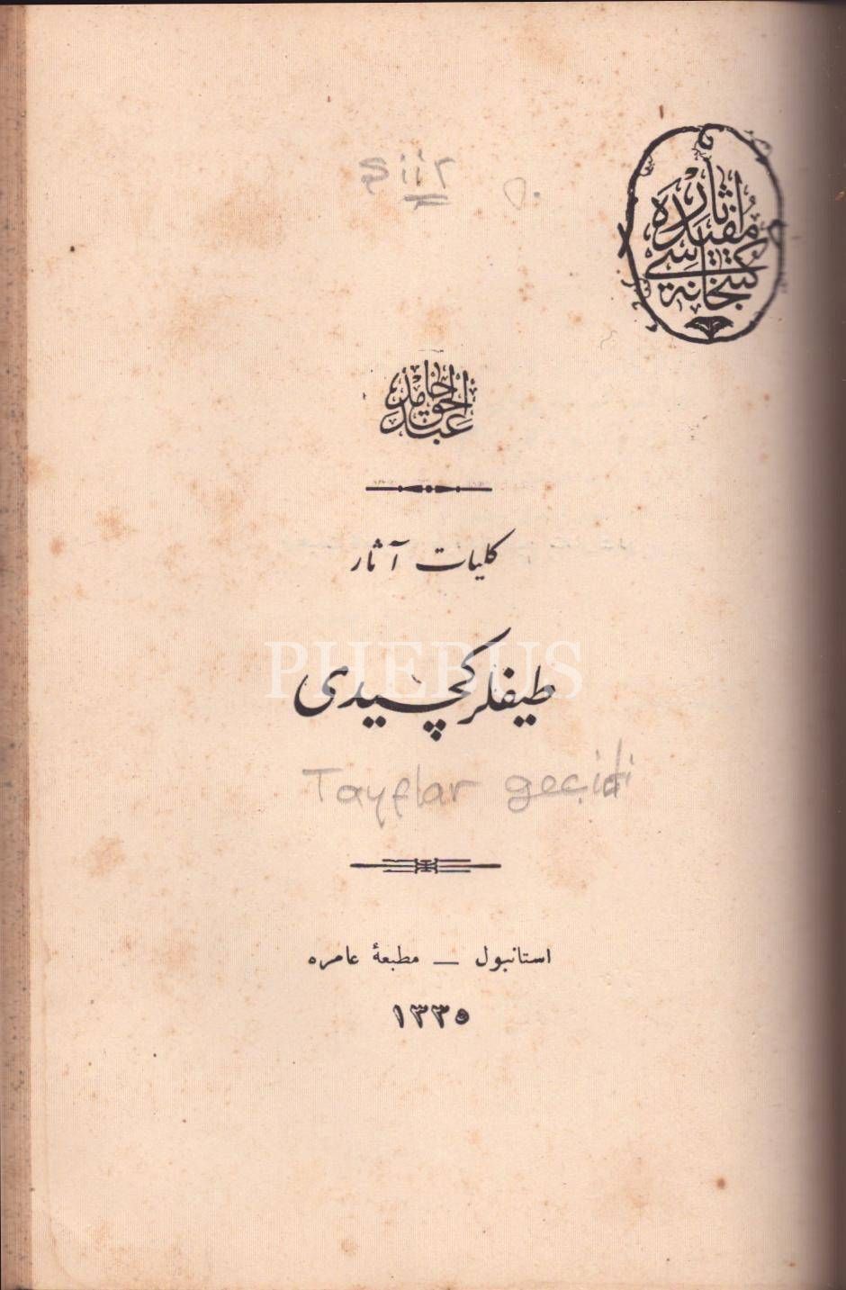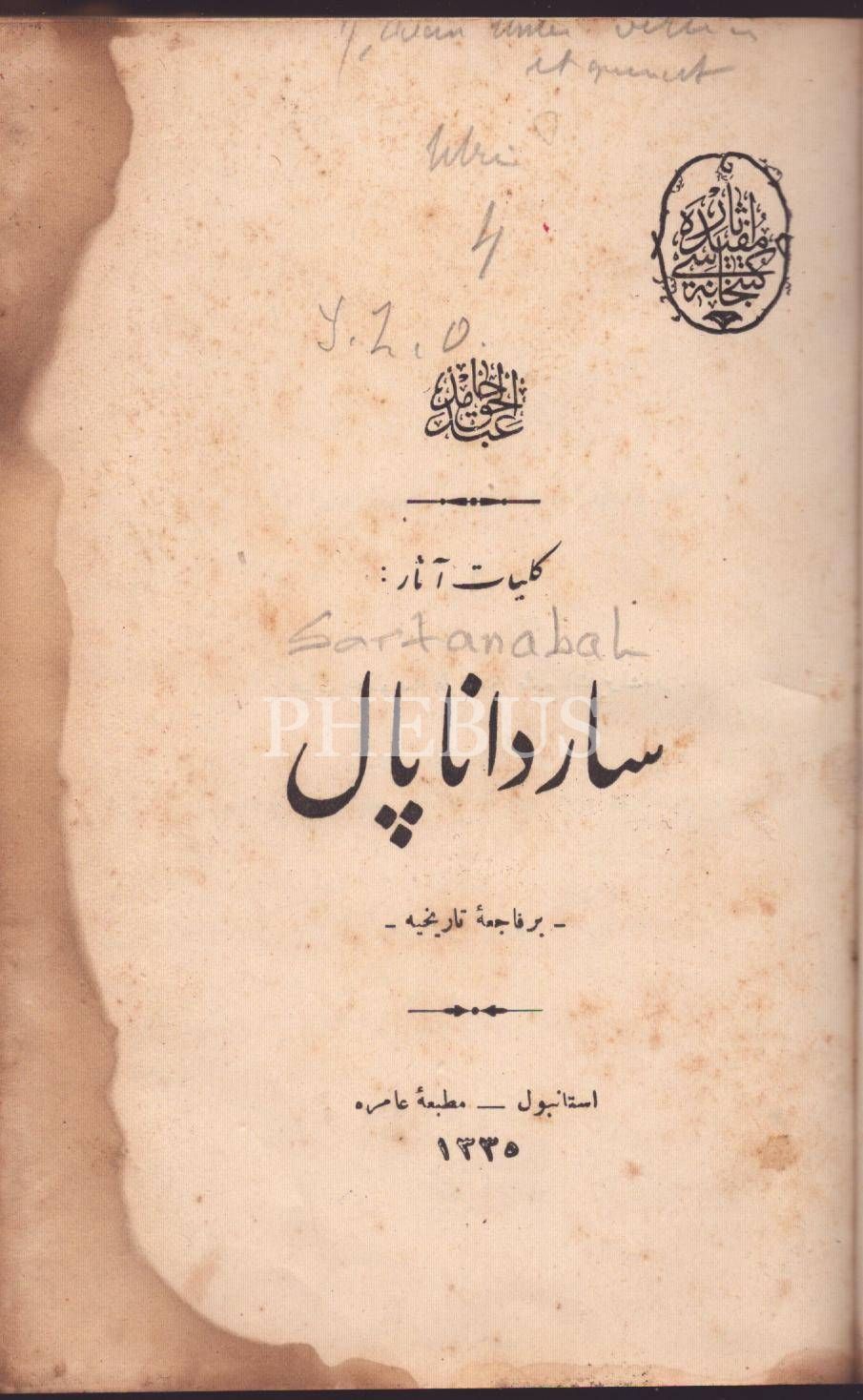 Abdülhak Hâmid Tarhan´a ait 5 eser tek ciltte: SARDANAPAL (Bir Fâcia-i Târîhiyye), 170 s.; ABDULLAH ES-SAGÎR- NAZÎFE, Abdülhak Hâmid [Tarhan], 129 s.; YÂDİGÂR-I HARB, 131 s.; TAYFLAR GEÇİDİ, 114 s.; Amire Matbaası, İstanbul 1335, 13x19 cm