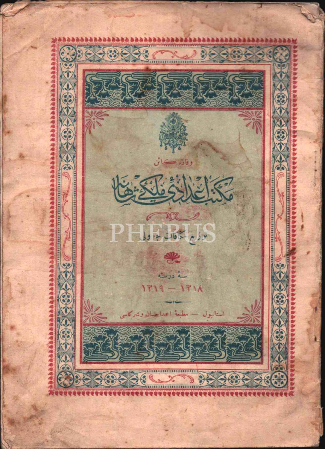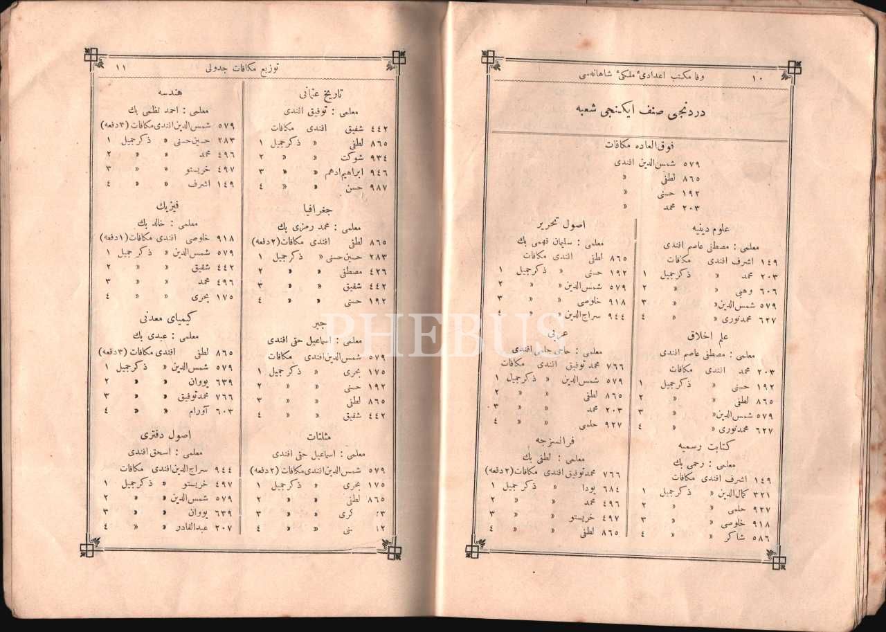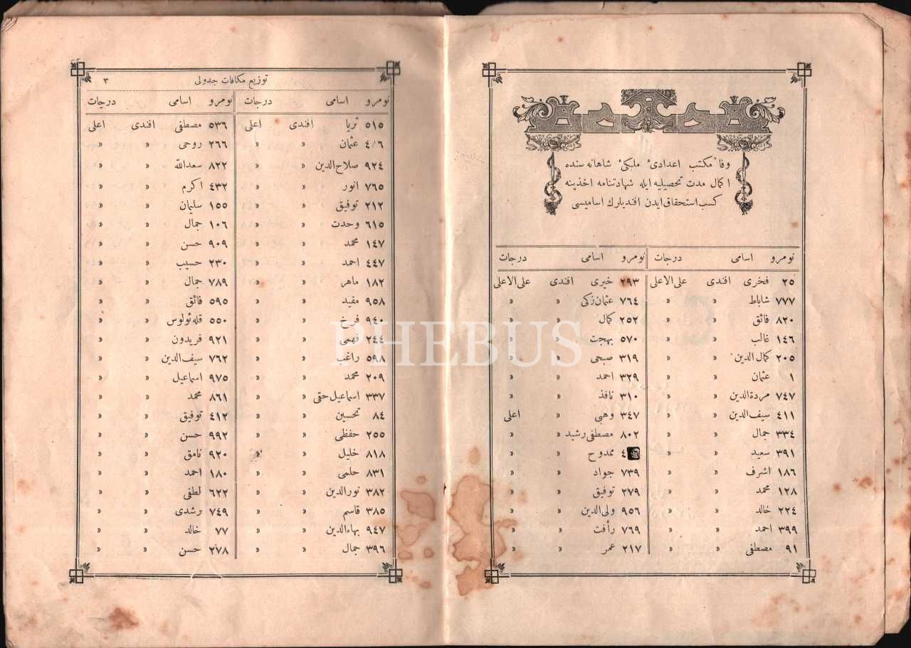 VEF´DA KÂİN MEKTEB-İ İDÂDÎ-İ MÜLKÎ-İ ŞÂHÂNE TEVZδ-İ MÜKÂFÂT CEDVELİ (1318-1319 Ders Senesi), Ahmed İhsan ve Şürekası Matbaası, İstanbul, 33 s., 16x23 cm