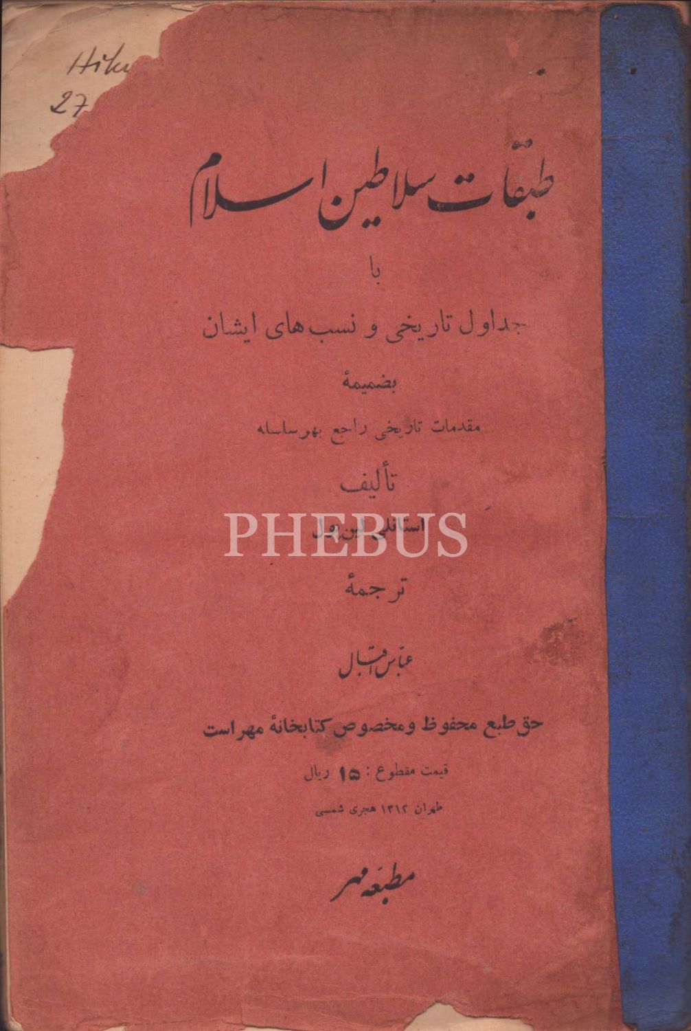 Farsça TABAKÂT-I SELÂTÎN-İ İSLÂM (Bâ Cedâvil-i Târîhî ve Nesebhâ-yı Îşân) [İslam Hükümdarları- Kronoloji ve Nesebleri], Stanley Lane Poole, çev. Abbas İkbal, Mühr Matbaası, Tahran 1312, 339 s., 14x22 cm