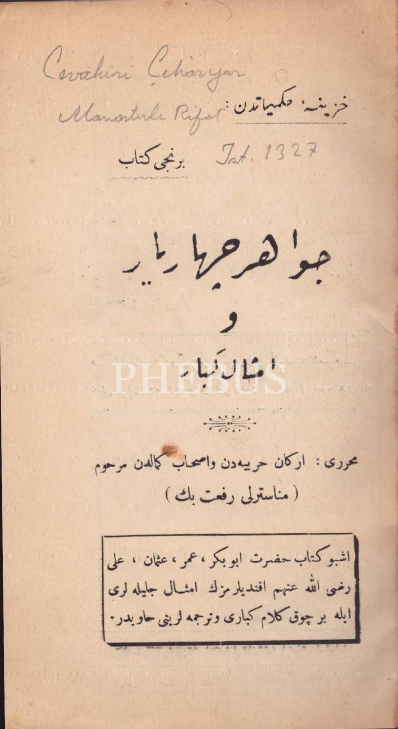 CEVÂHİR-İ ÇEHÂRYÂR VE EMSÂL-İ KİBÂR, Manastırlı Rifat Bey, Uhuvvet Matbaası, Haleb 1327, 96 s., 11x19 cm