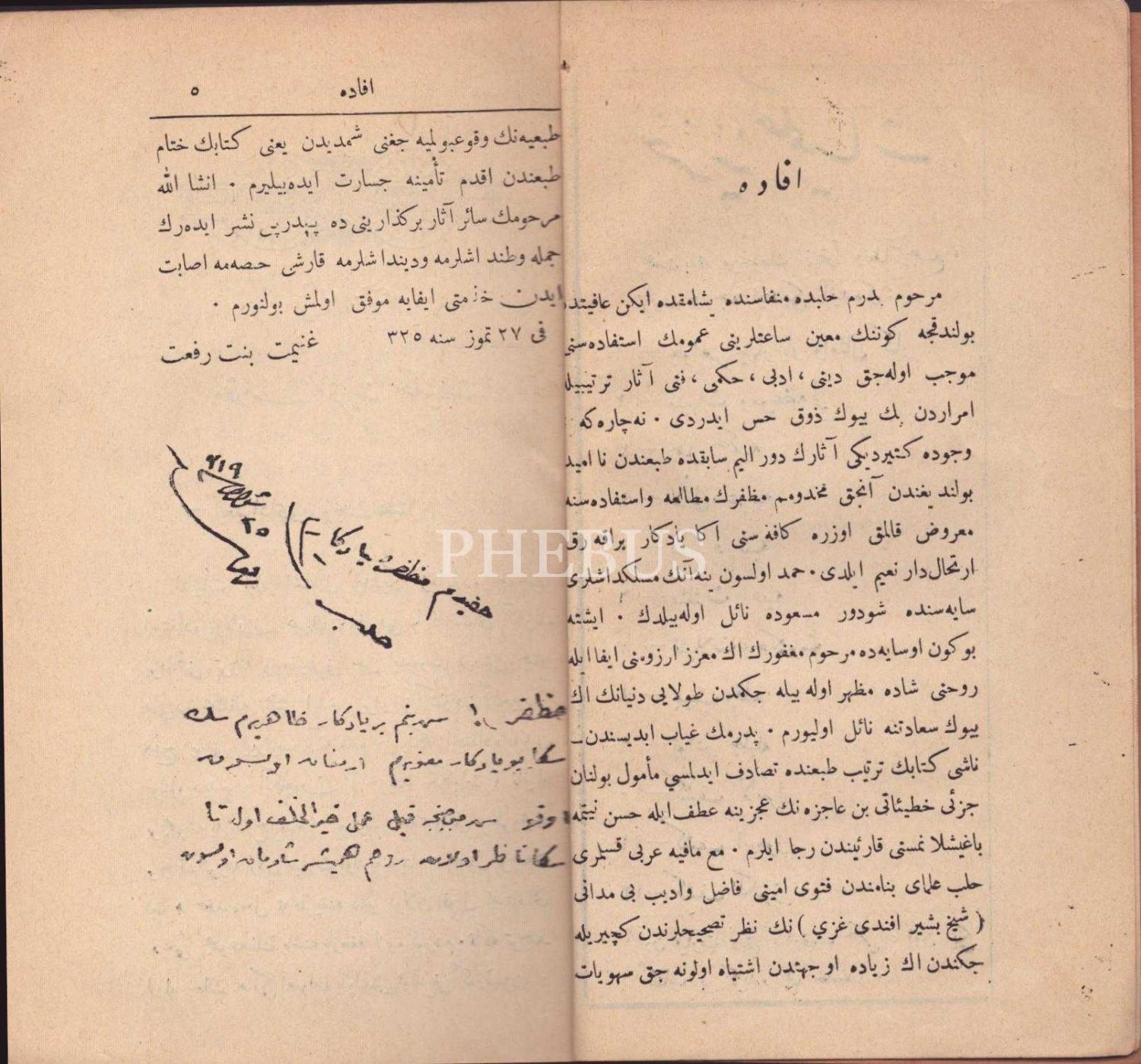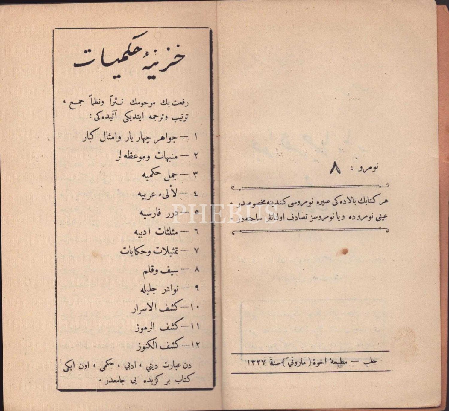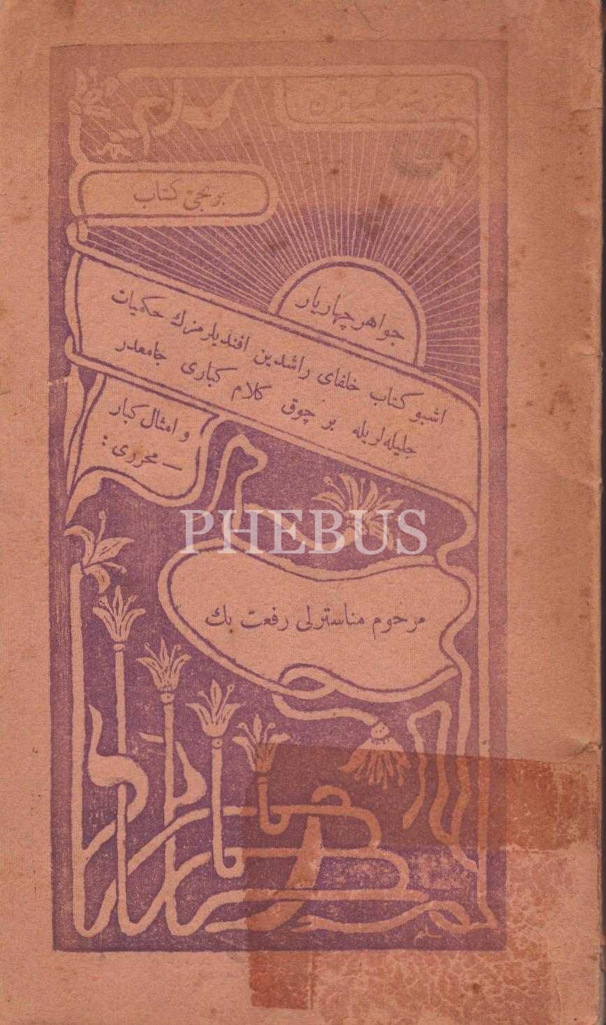 "İşbu kitab Hz. Ebubekir, Ömer, Osman, Ali (r.a.) efendilerimizin emsal-i celileleri ile birçok kelâm-ı kibarı ve tercümelerini hâvidir."