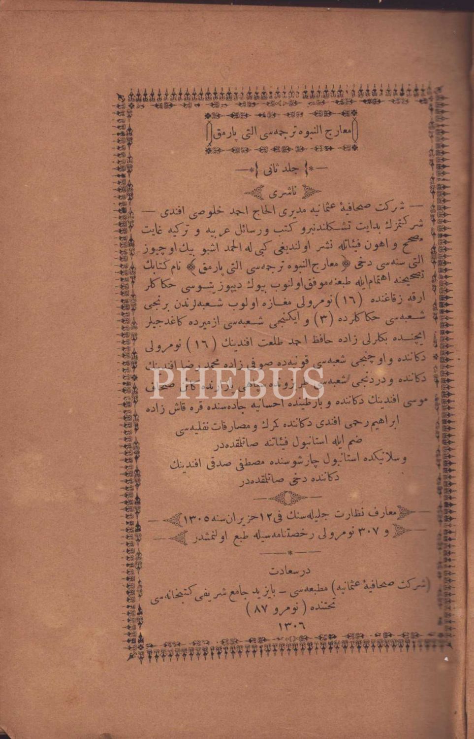 MEÂRİCÜ´N-NÜBÜVVET TERCÜMESİ ALTIPARMAK (2. Cilt), Şirket-i Sahafiye-i Osmaniye Matbaası, İstanbul 1306, 436 s., 17x25 cm