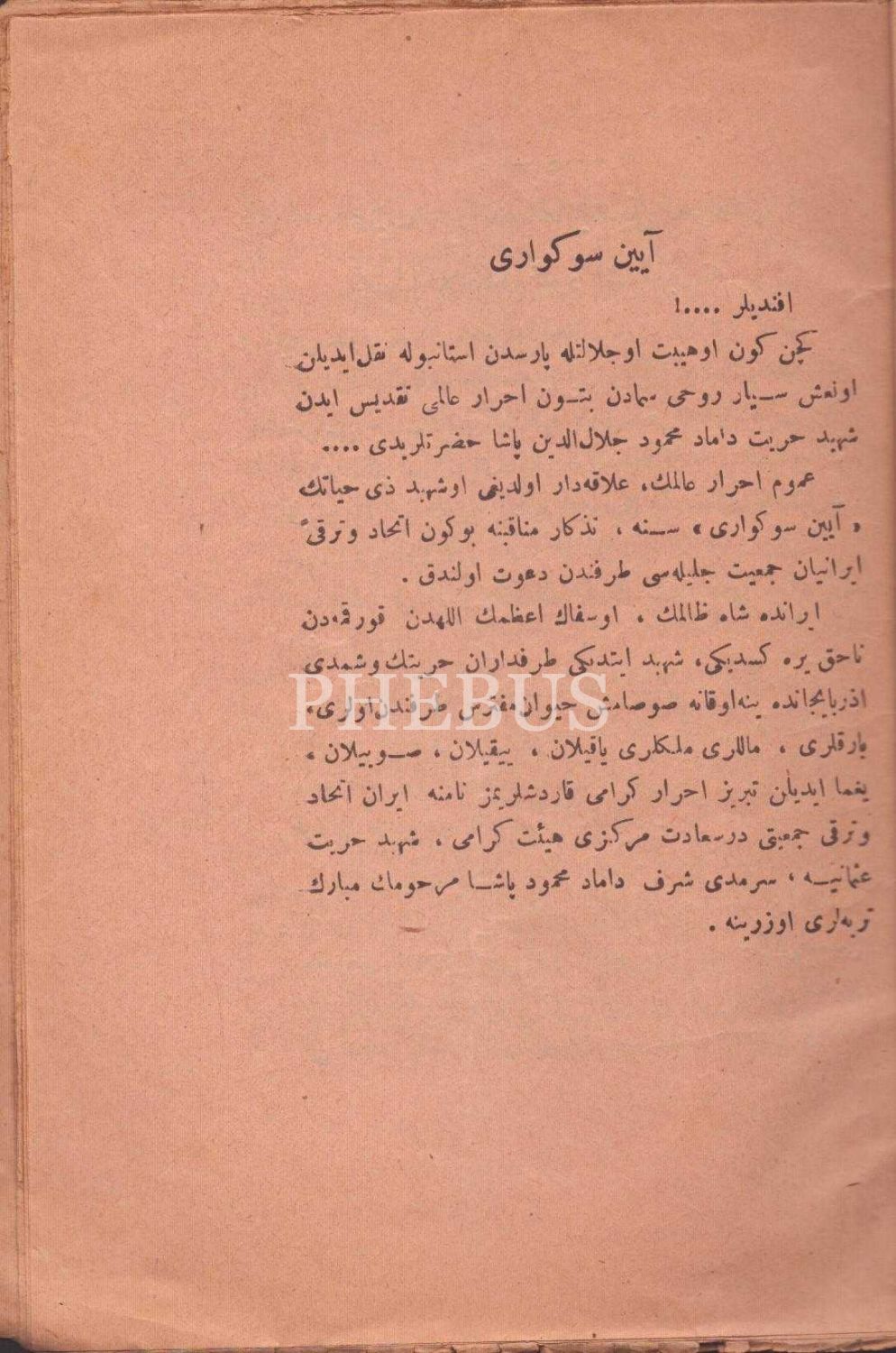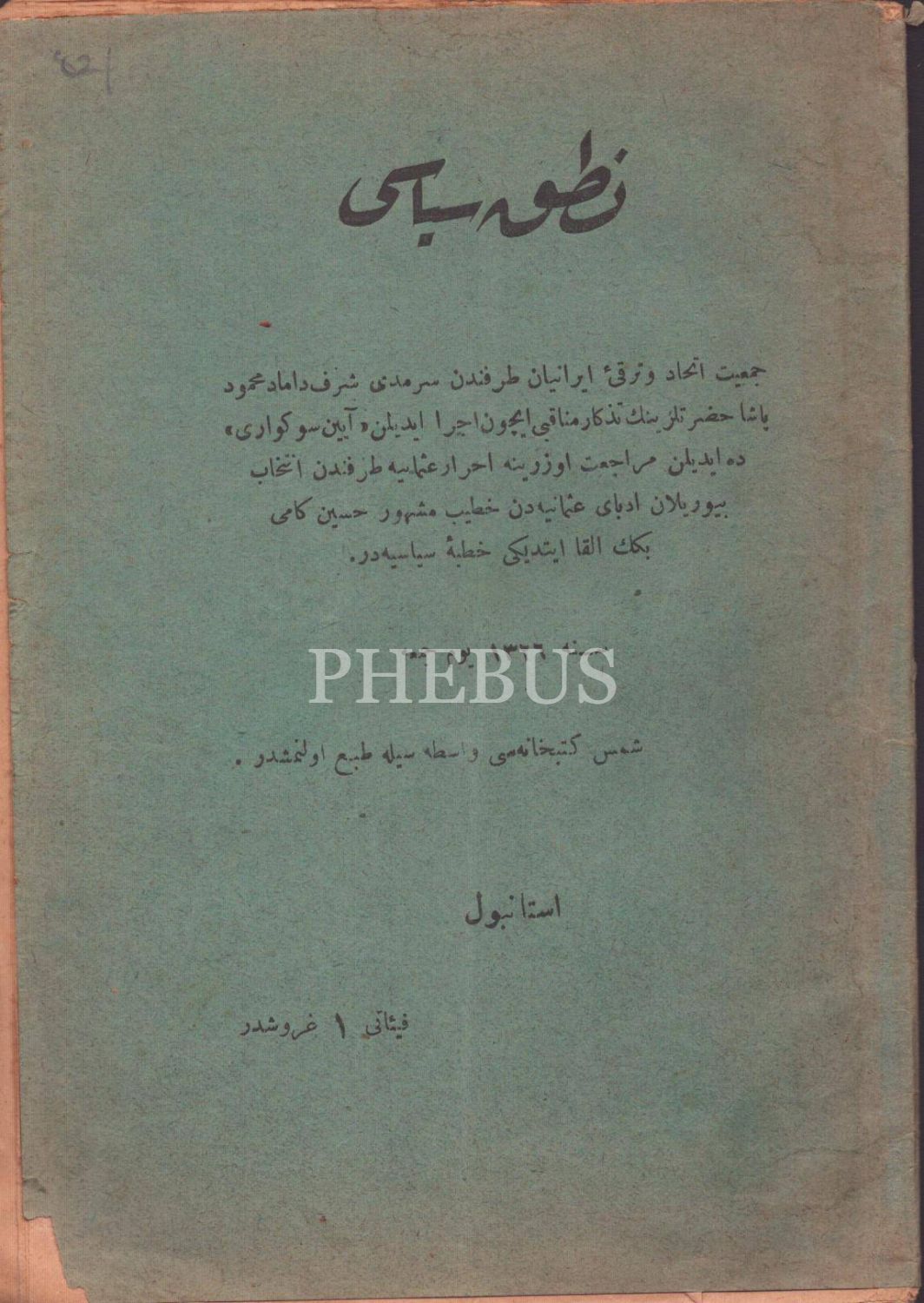 Cemiyet-i İttihad ve Terakkî-i İraniyân sermedi Şeref Damad Mahmud Paşa hazretlerinin tizkâr-ı menakıbı için icra eidlen ´Ayin-i Sevkvâri´de edilen müracaat üzerine Ahrar-ı Osmaniye tarafından intihab buyurulan üdeba-yı Osmaniyeden hatib-i meşhur Hüseyin Kâmi Bey´in ilkâ etdiği hutbe-i siyasiyedir."