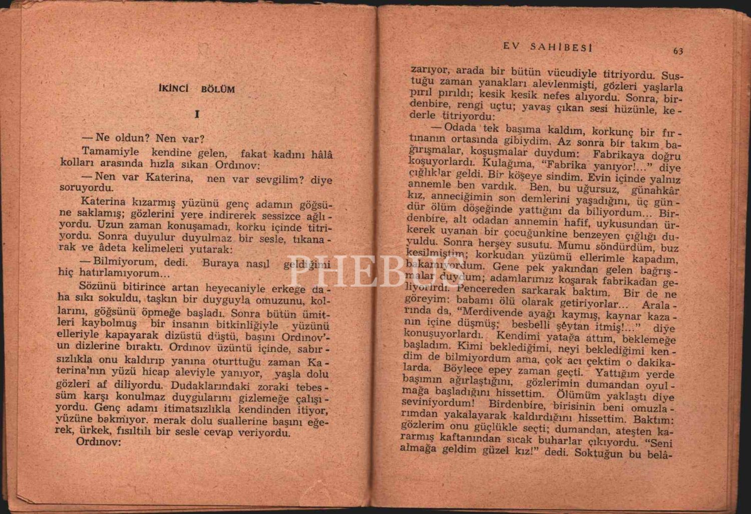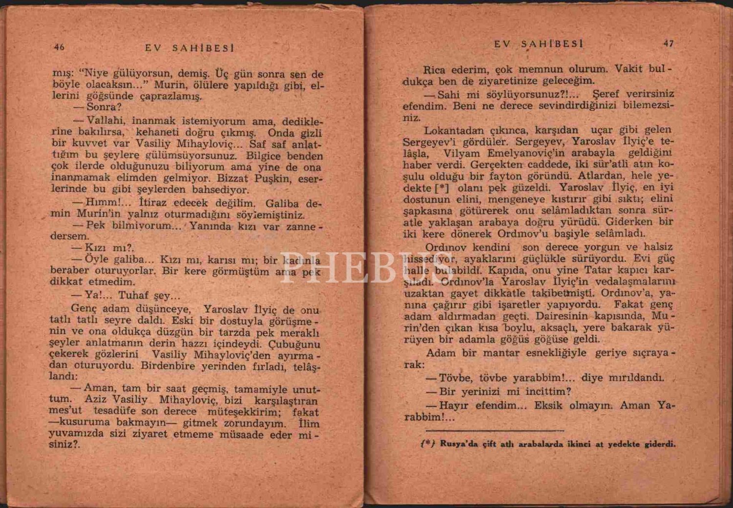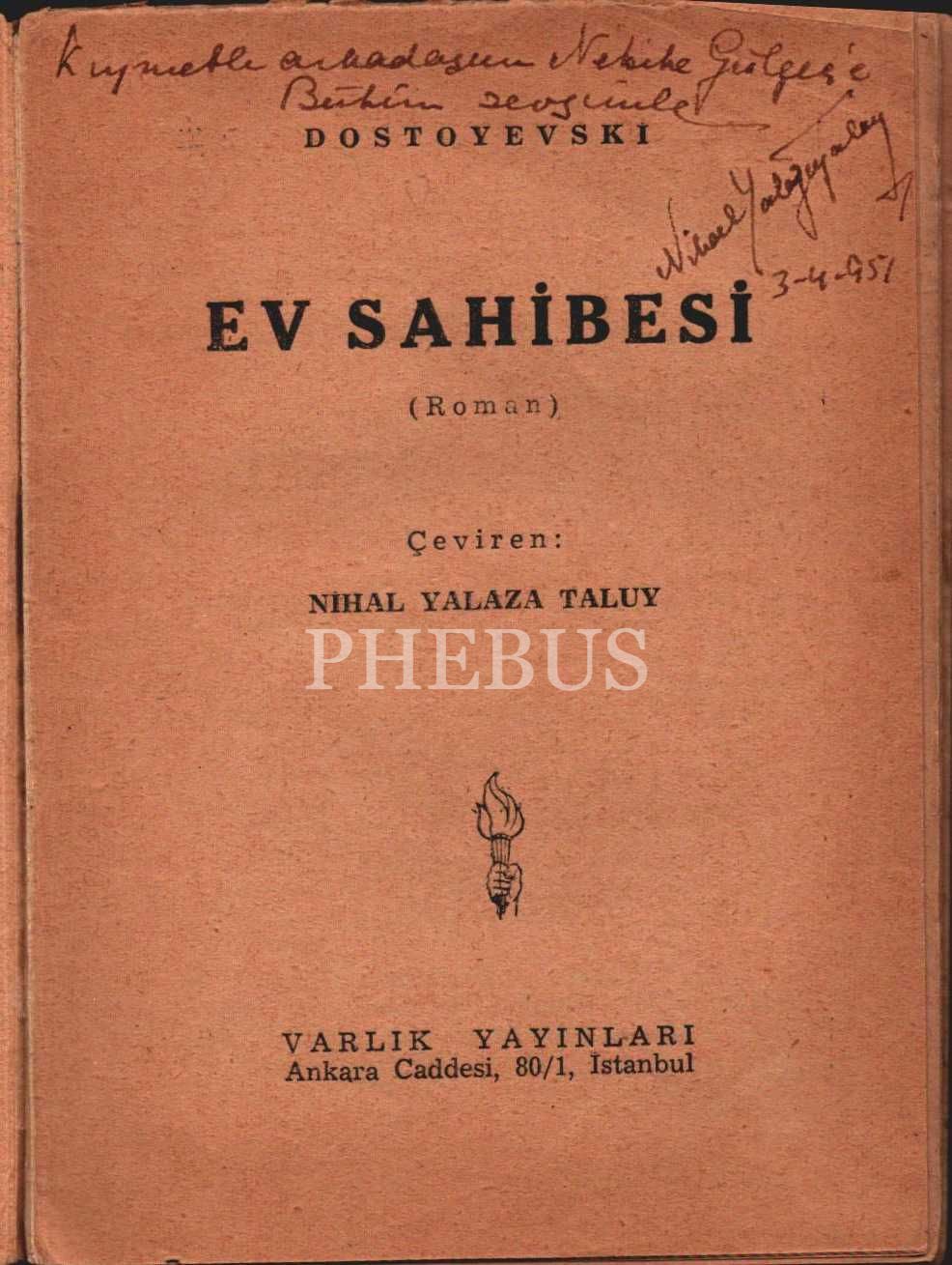 Puşkin, Gogol, Tolstoy, Dostoyevski, Turgenyev gibi, Rus edebiyatının belli başlı bütün yazarlarının eserlerini Rusçadan Türkçeye çeviren, edebiyatımızın en yetkin çevirmenlerinden Nihal Yalaza Taluy’un (1910 – 1968), Dostoyevski´nin uzun hikâyesi “Ev Sahibesi” çevirisinin ilk basımı…