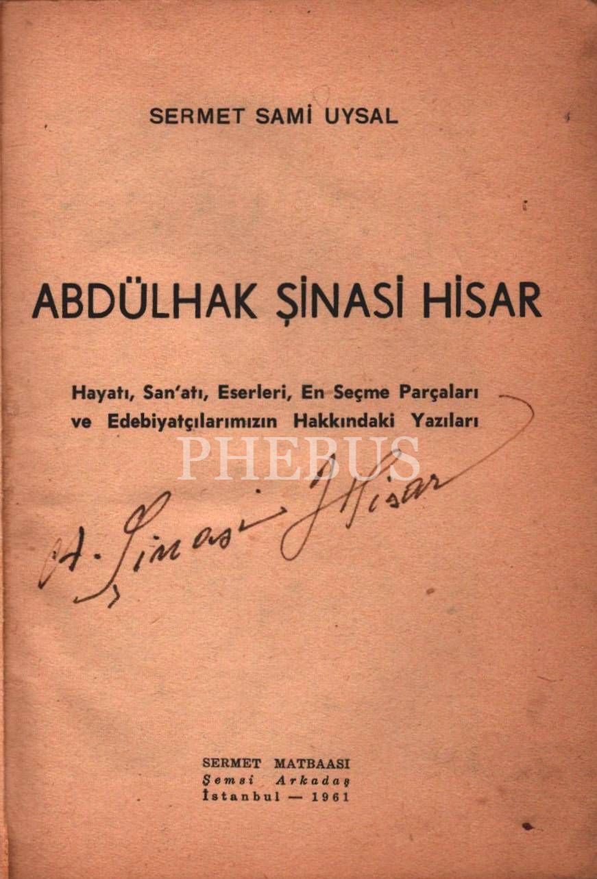 ABDÜLHAK ŞİNASİ HİSAR (Hayatı, San'atı, Eserleri, En Seçme Parçaları ve Edebiyatçılarımızın Hakkındaki Yazıları), Sermet Sami Uysal, 1961, Sermet Matbaası, 272 sayfa, 12x16,5 cm… ABDÜLHAK ŞİNASİ HİSAR´DAN İMZALI…