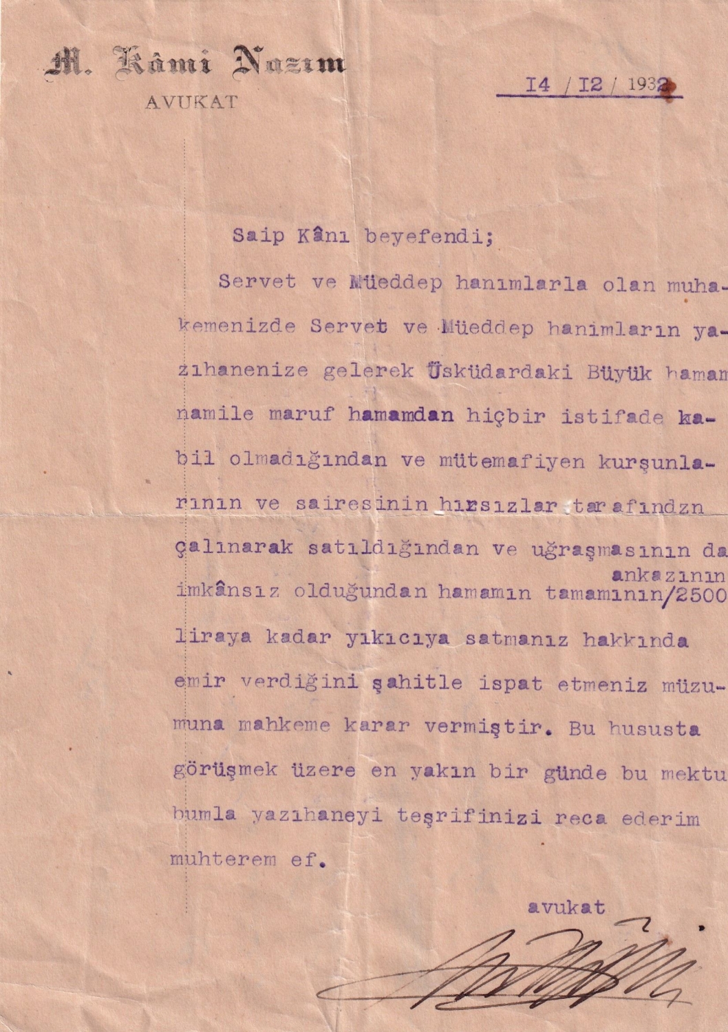 Avukat Kami Nazım imzalı, 1932 tarihli döküman