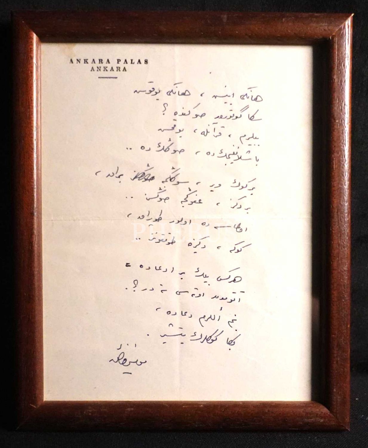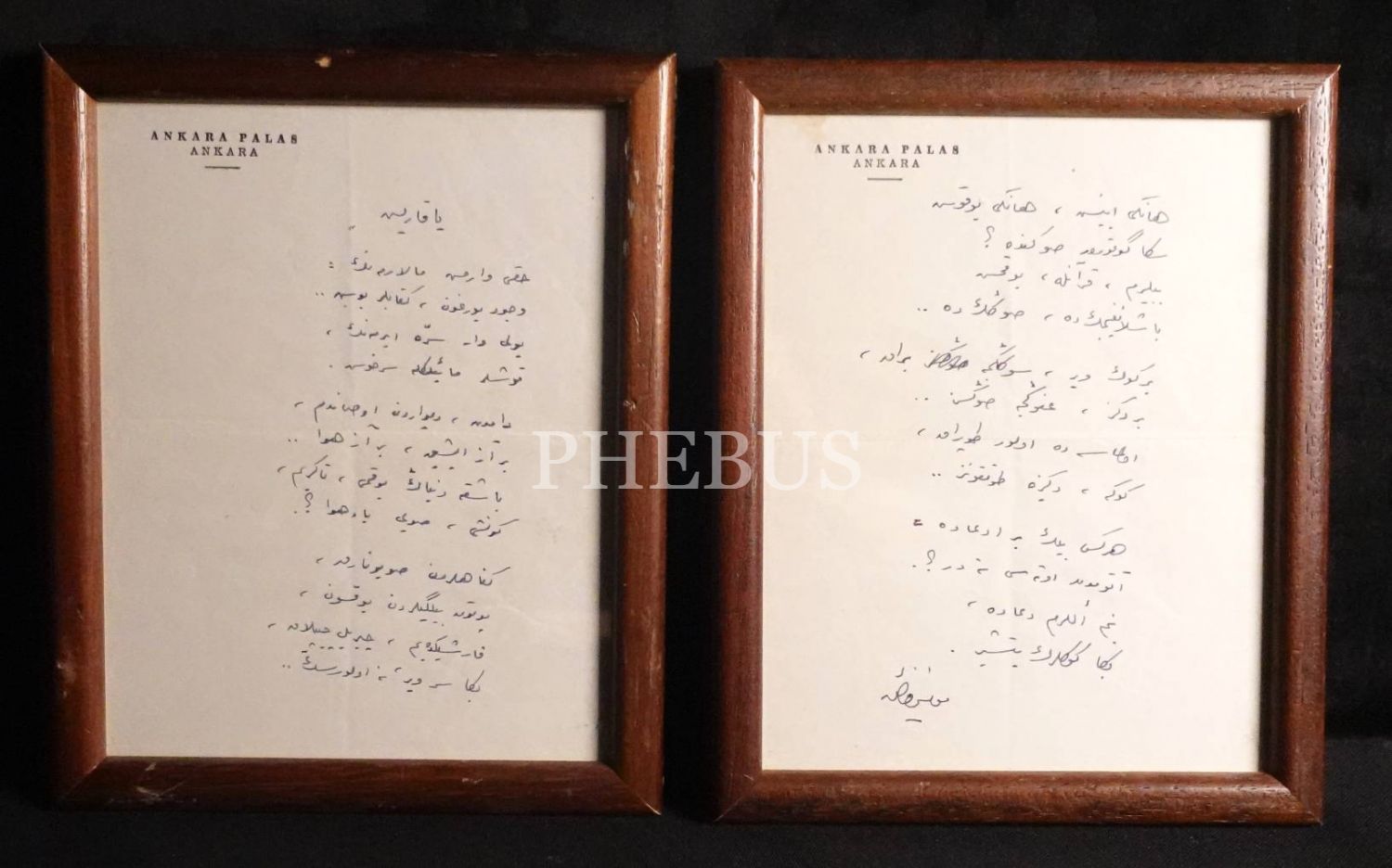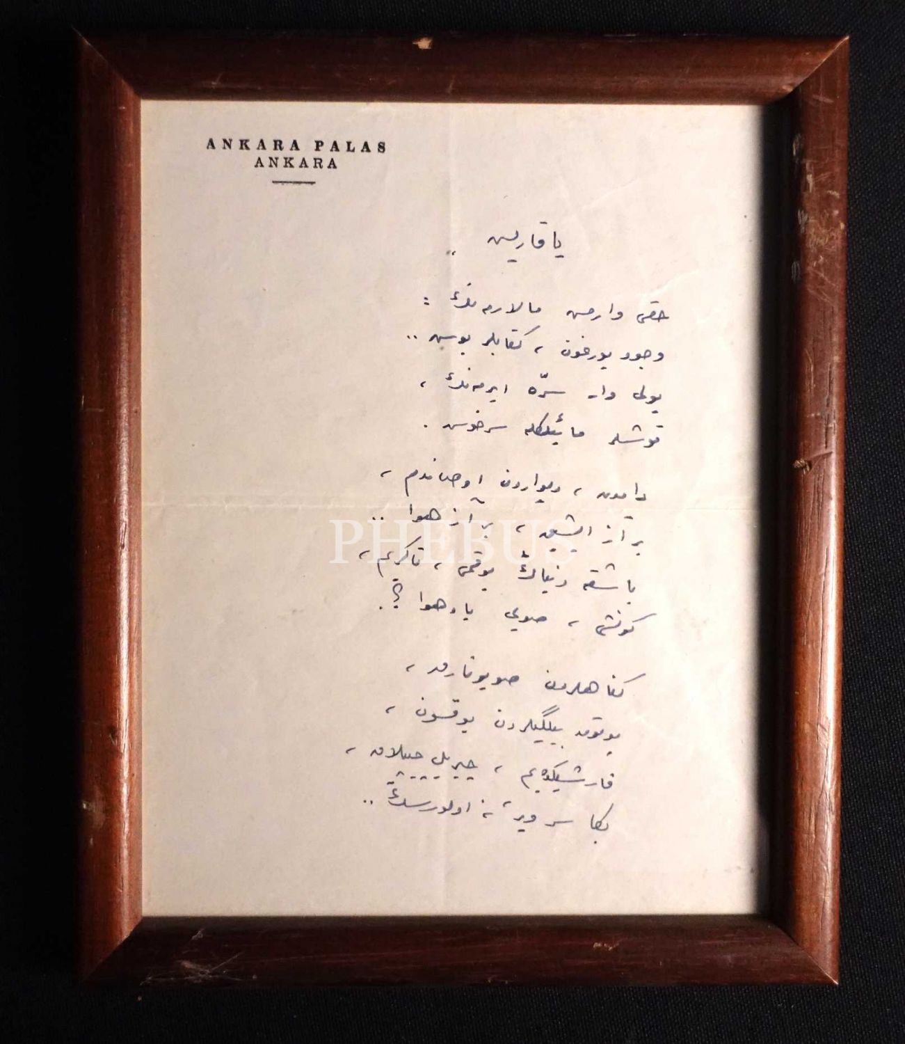Servet-i Fünûn şairlerinden Faik Ali´nin oğlu, Hisar dergisi kurucularından Munis Faik Ozansoy´un (1911 - 1975) Osmanlıca el yazısıyla kaleme aldığı, altı dörtlükten oluşan "Yakarış" şiiri… "Damdan, duvardan usandım / Biraz ışık, biraz hava / Başka dünyan yok mu Tanrım / Güneşi, suyu bedava?" / "Ankara Palas" antetli iki sayfa halindeki şiir, eski ve şık, iki ahşap çerçeve içinde (Çerçeve boyutları: 17 X 21 cm)...