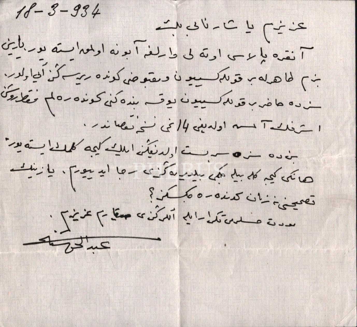 Yazmaya oldukça geç başlayan ve ilk kitabını 50 yaşından sonra yayımlayan Abdülhak Şinasi Hisar´ın (1887 - 1963), Varlık dergisi ve Varlık Yayınları kurucusu Yaşar Nabi´ye, Ankara Palas Oteli´nin Varlık dergisine abone olma isteğini ilettiği, 18.3.1934 tarihli düzeltme mektubu...