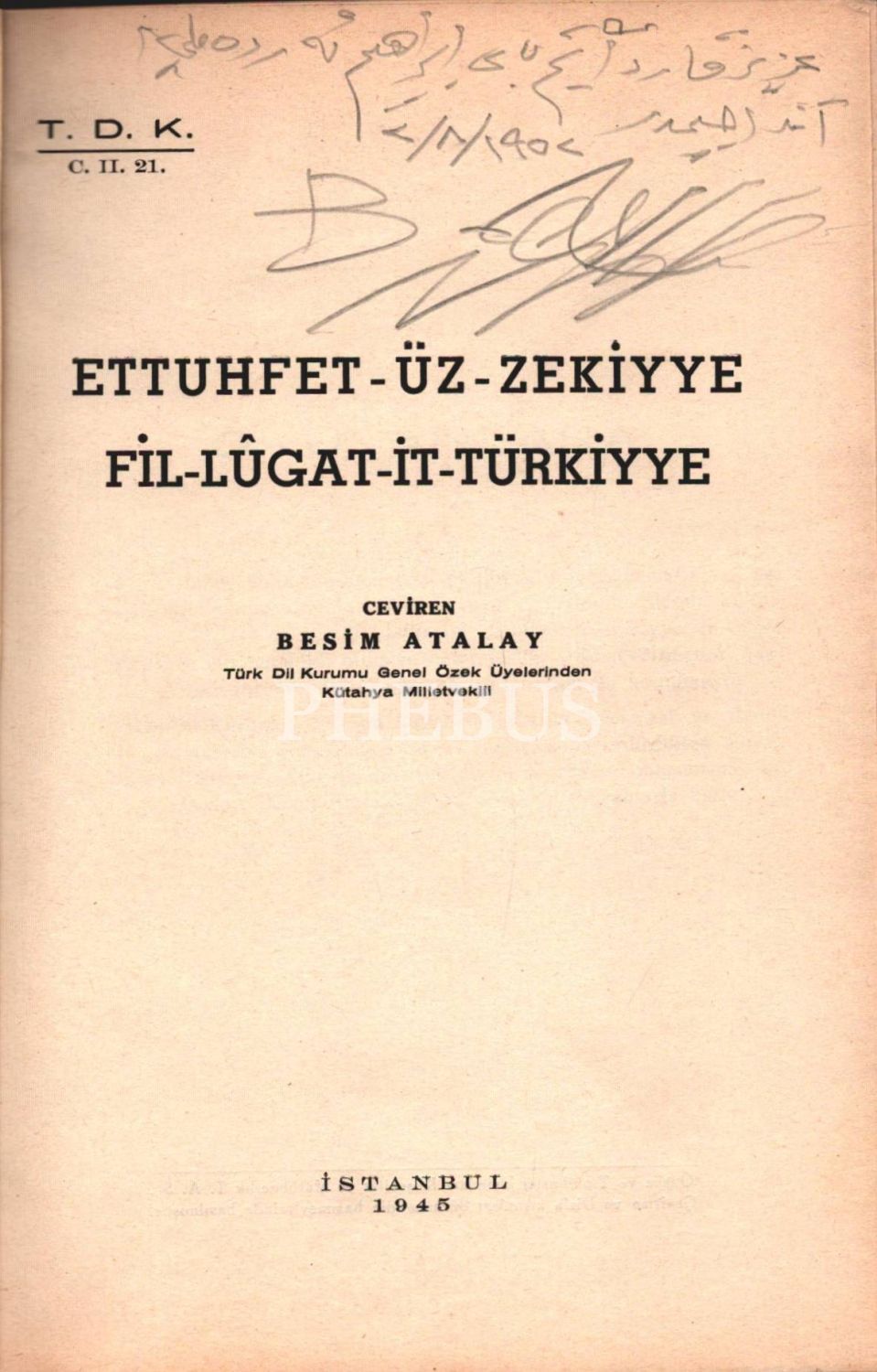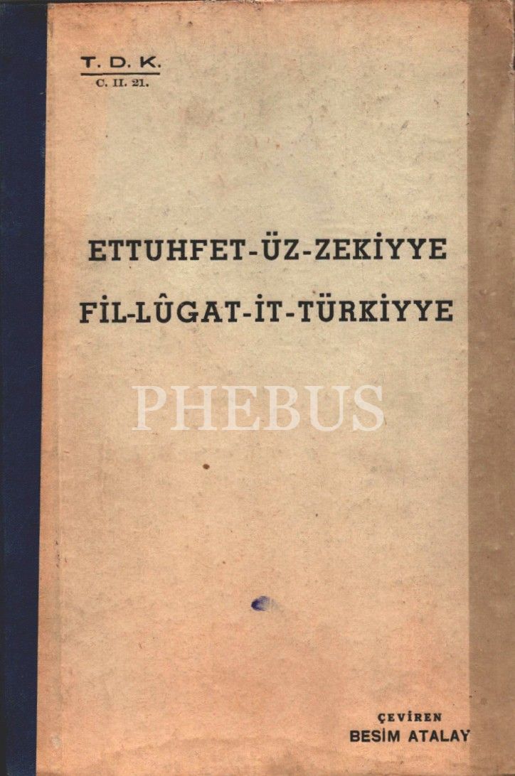 Çeviren Besim Atalay´dan Osmanlıca ithaflı ve imzalı ET-TUHFET-ÜZ-ZEKİYYE FİL-LÛGAT-İT-TÜRKİYE, İstanbul 1945, 296+92 sayfa, 17x25 cm