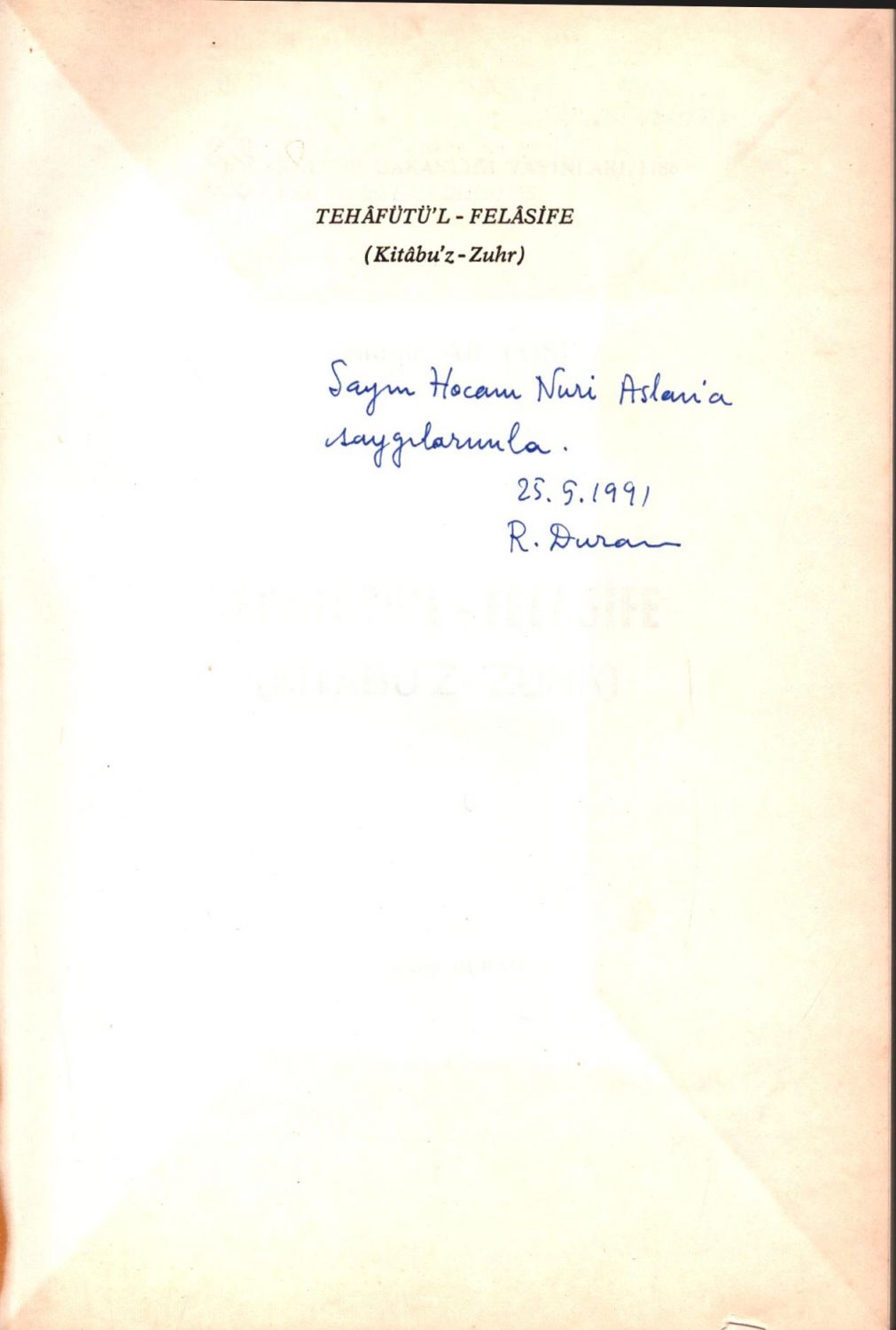 İthaf "Sayın Hocam Nuri Aslan´a saygılarımla. 25.5.1991 R. Duran" şeklindedir.