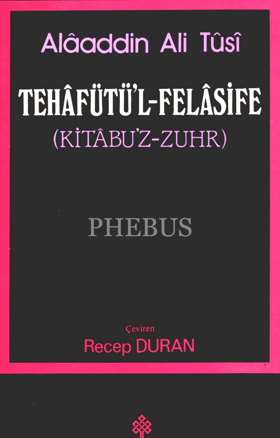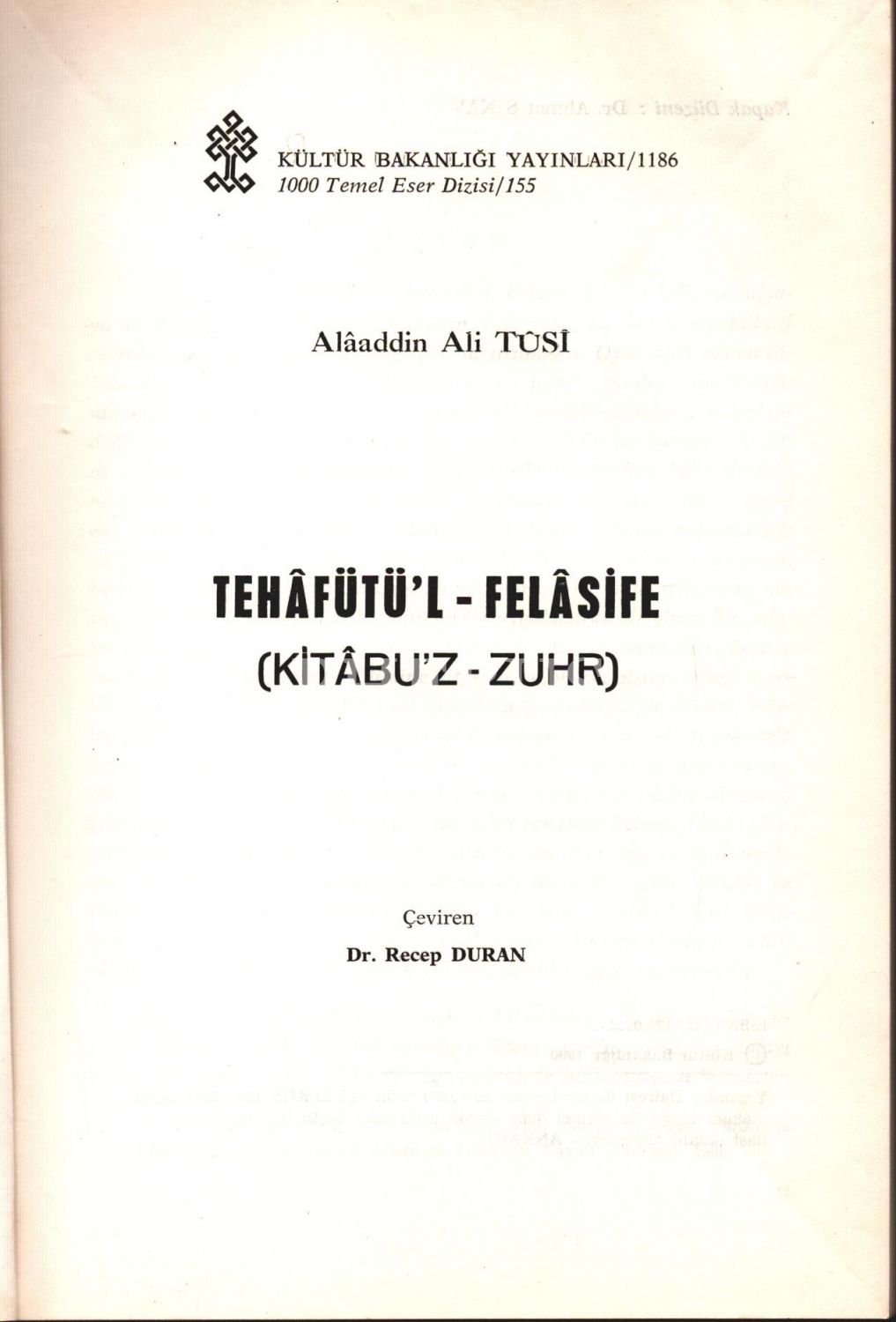 Çeviren Recep Duran´dan imzalı TEHÂFÜTÜ´L-FELÂSİFE (KİTÂBU´Z-ZUHR), Alâaddin Ali Tûsî, Kültür Bakanlığı Yayınları, Ankara 1990, 291 sayfa, 16x24 cm