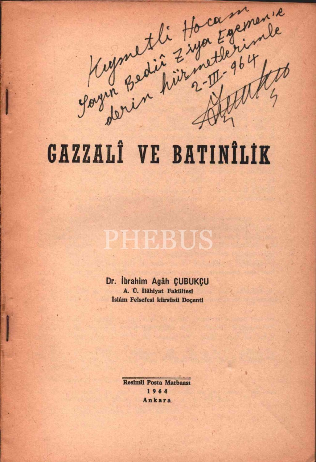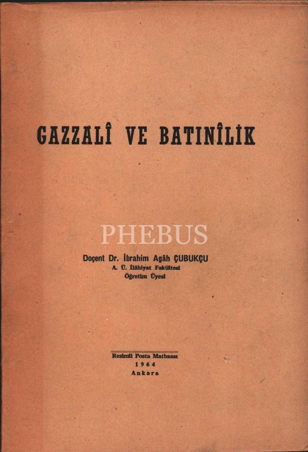 İbrahim Agâh Çubukçu tarafından imzalı GAZZALÎ VE BATINÎLİK, Resimli Posta Matbaası, Ankara 1964, 77 sayfa, 17x24 cm