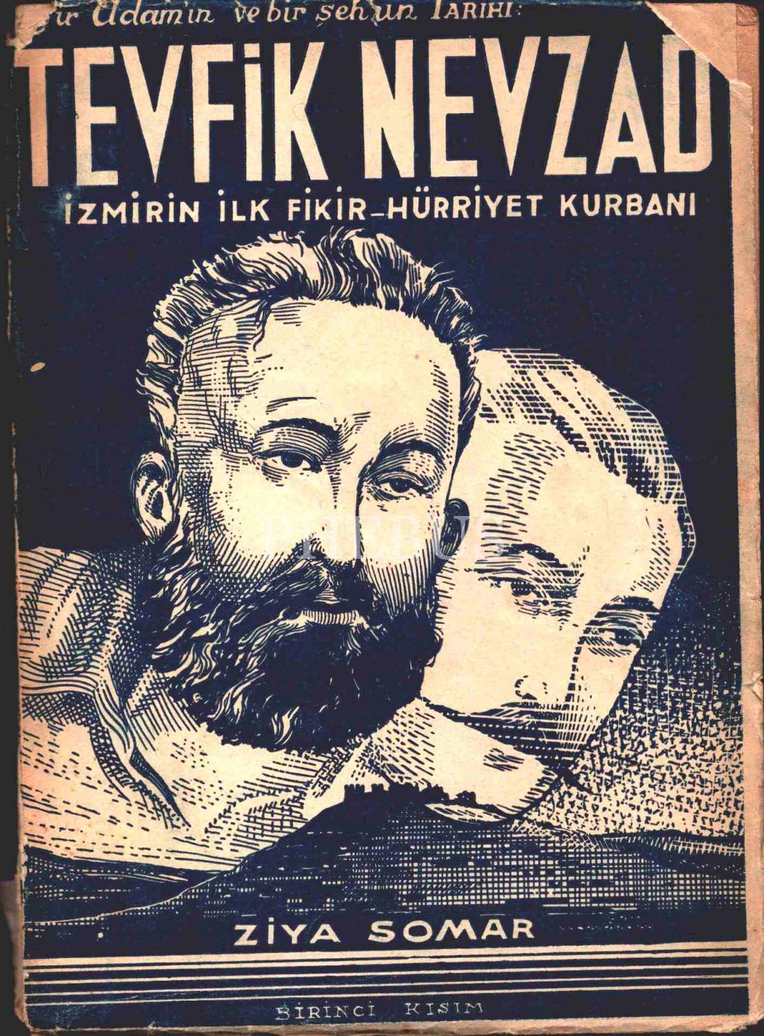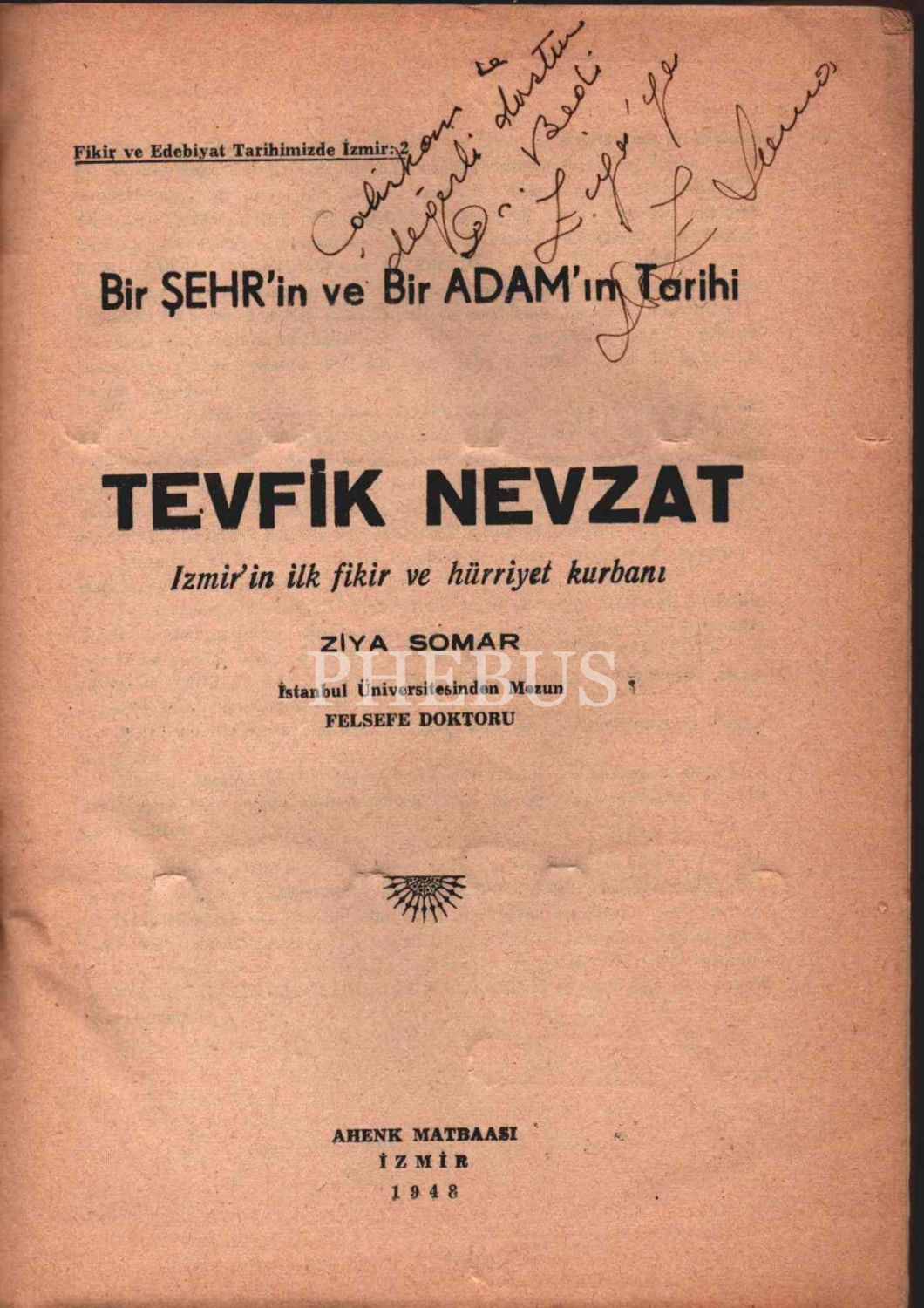 Ziya Somar´dan ithaflı ve imzalı Bir Şehr´in ve Bir Adam´ın Tarihi TEVFİK NEVZAD (İzmir´in İlk Fikir Ve Hürriyet Kurbanı), Ahenk Matbaası, İzmir 1948, 216 sayfa, 17x24 cm