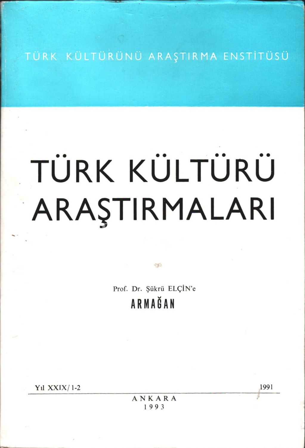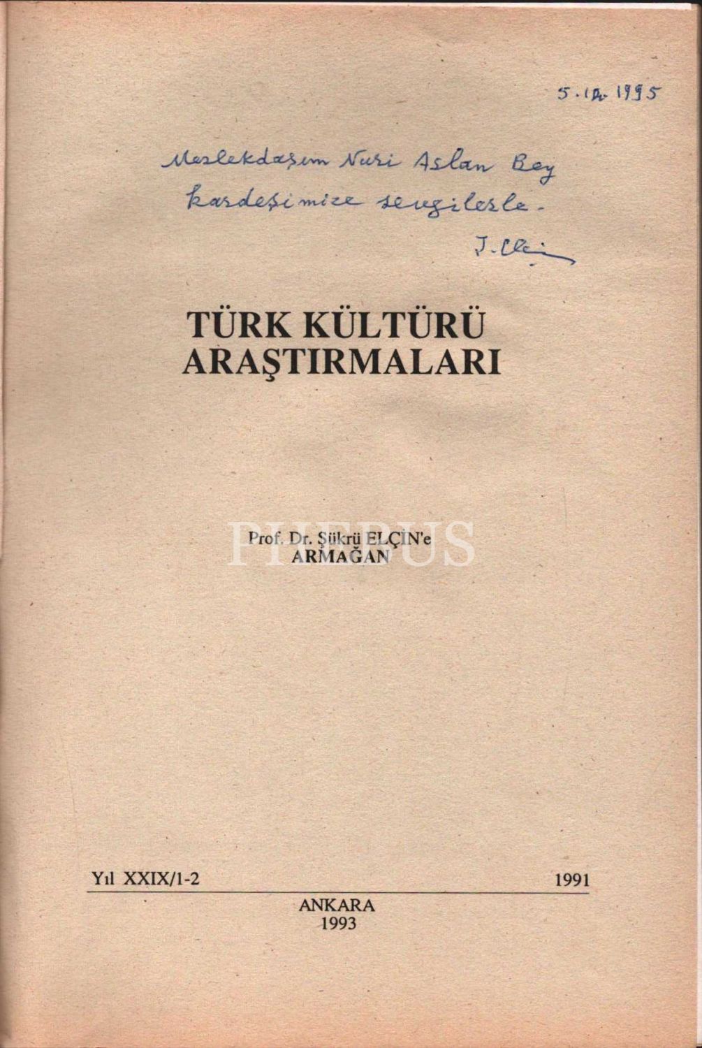 Şükrü Elçin tarafından ithaflı ve imzalı, Türk Kültürünü Araştırma Enstitüsü TÜRK KÜLTÜRÜ ARAŞTIRMALARI, Ankara 1993, 415 sayfa, 16x24 cm
