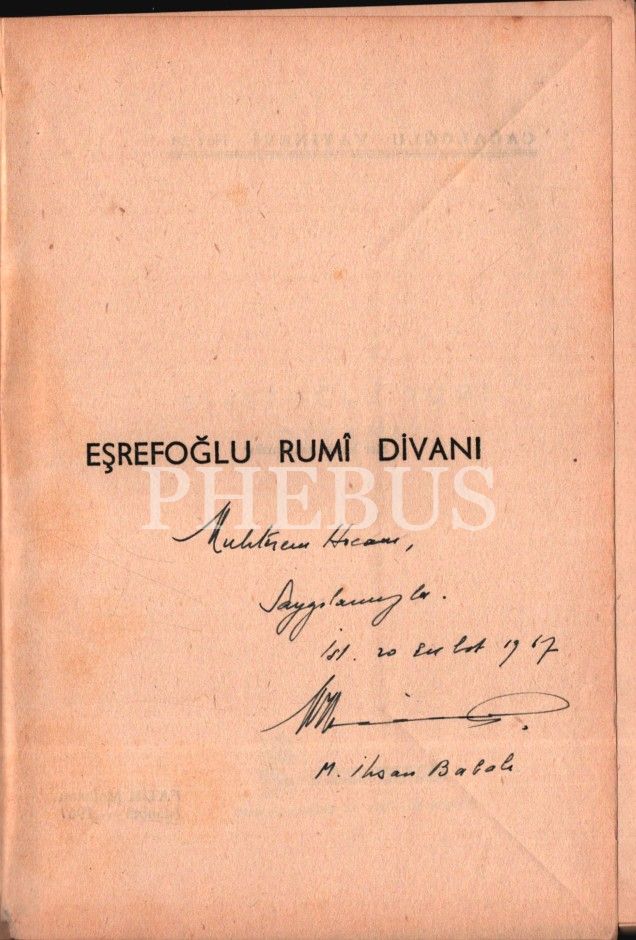 M. İhsan Balalı tarafından ithaflı ve imzalı EŞREFOĞLU RUMÎ DİVANİ, Cağaloğlu Yayınevi, İstanbul 1967, 80 sayfa, 17x24 cm