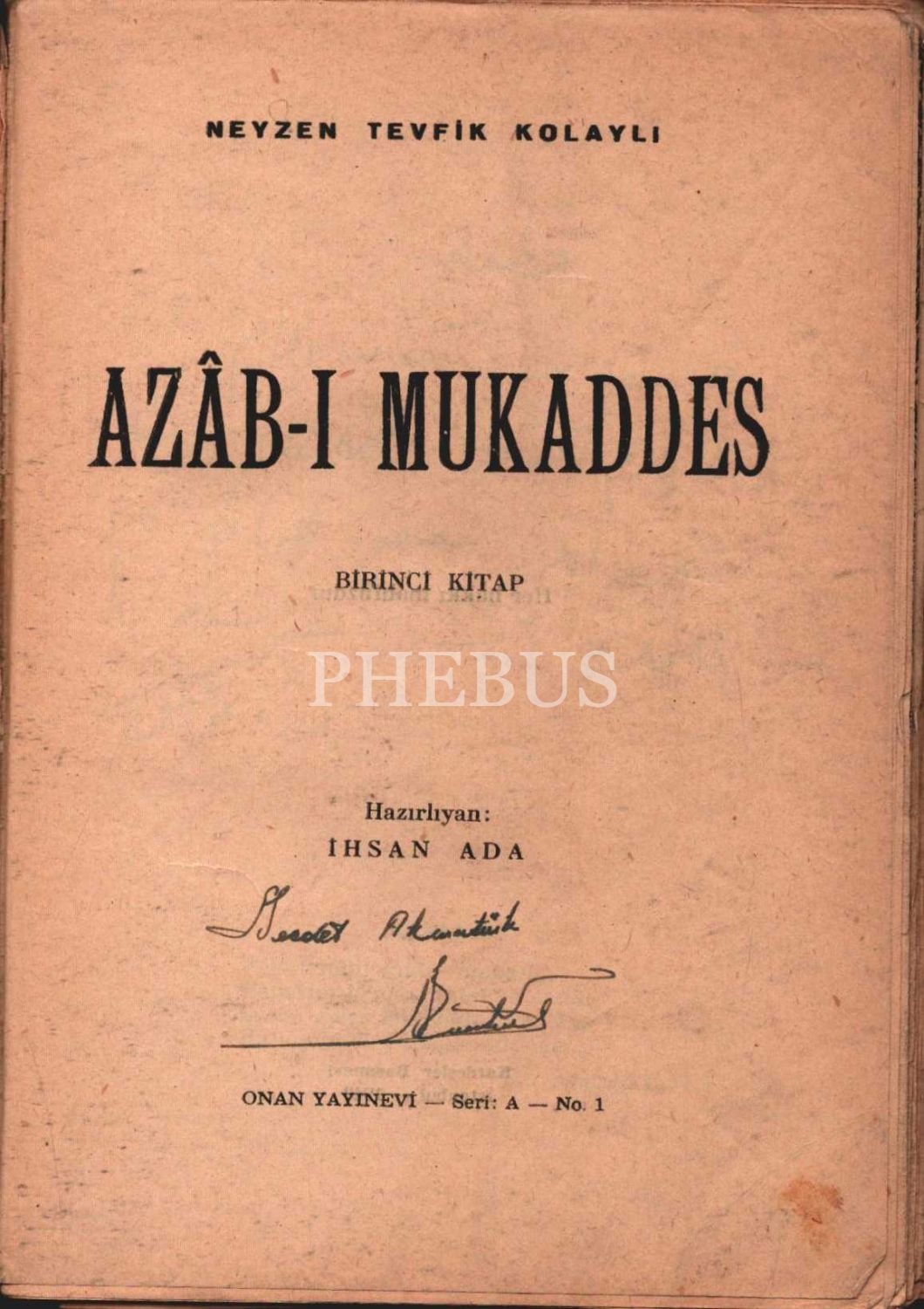 AZÂB-I MUKADDES, Neyzen Tevfik Kolaylı, hazırlayan: İhsan Ada, Onan Yayınevi, İstanbul 1949, 304 sayfa, 14x20 cm