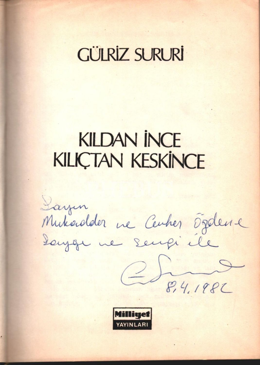 Gülriz Sururi tarafınfan ithaflı ve imzalı KILDAN İNCE KILIÇTAN KESKİNCE, Milliyet Yayınları, 1978, 478 sayfa, 14x20 cm