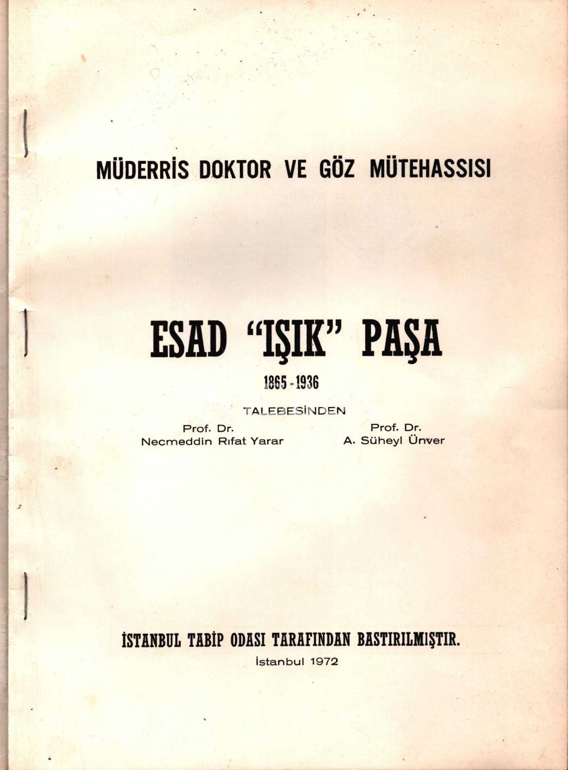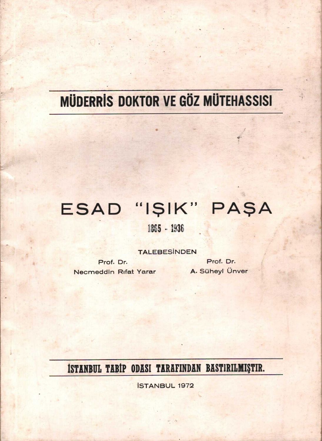 MÜDERRİS DOKTOR VE GÖZ MÜTEHASSISI ESAD IŞIK PAŞA (1865-1936), Necmeddin Rıfat Yarar & A. Süheyl Ünver, İstanbul Tabip Odası, İstanbul 1972, 16 sayfa, 20x28 cm