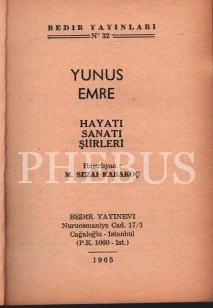 YUNUS EMRE (Hayatı, Sanatı, Şiirleri), Sezai Karakoç, Bedir Yayınevi, İstanbul 1965, 78 sayfa, 12x17 cm