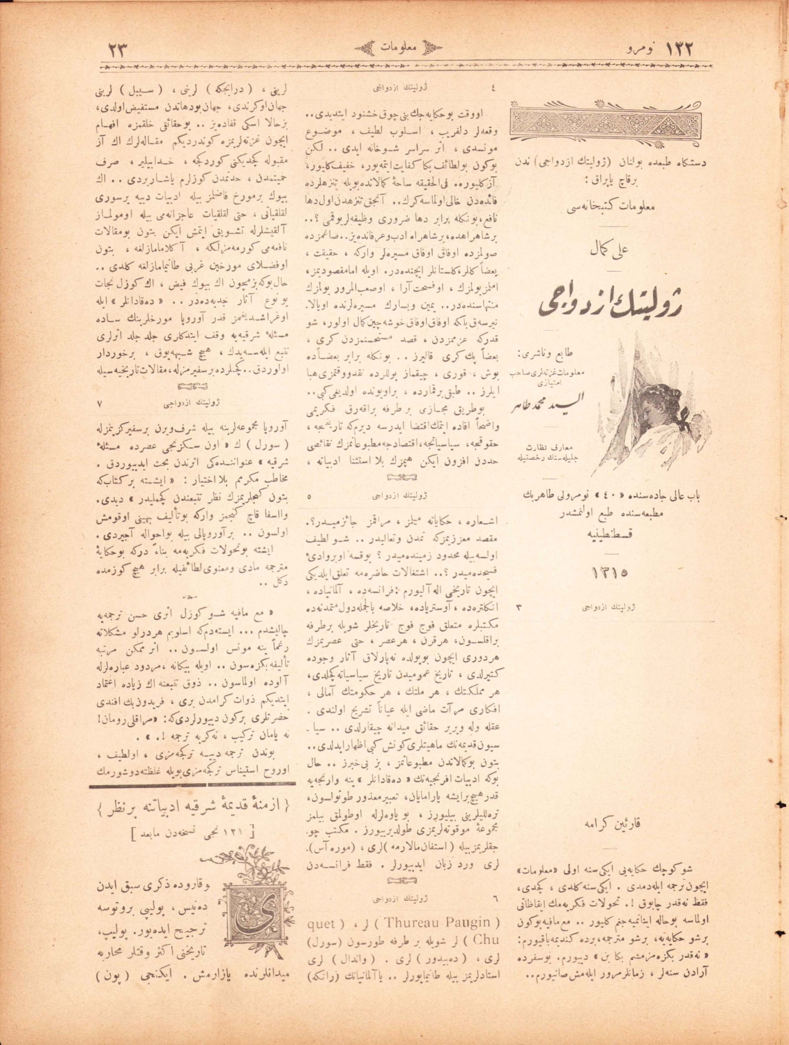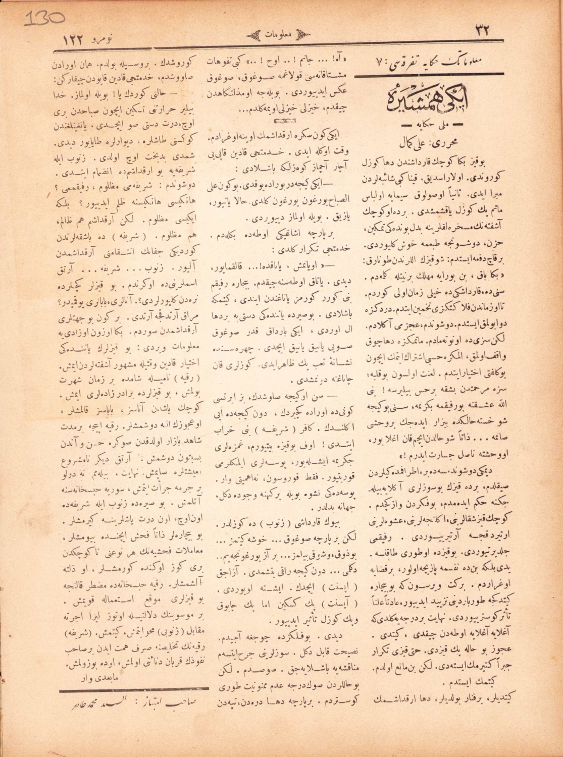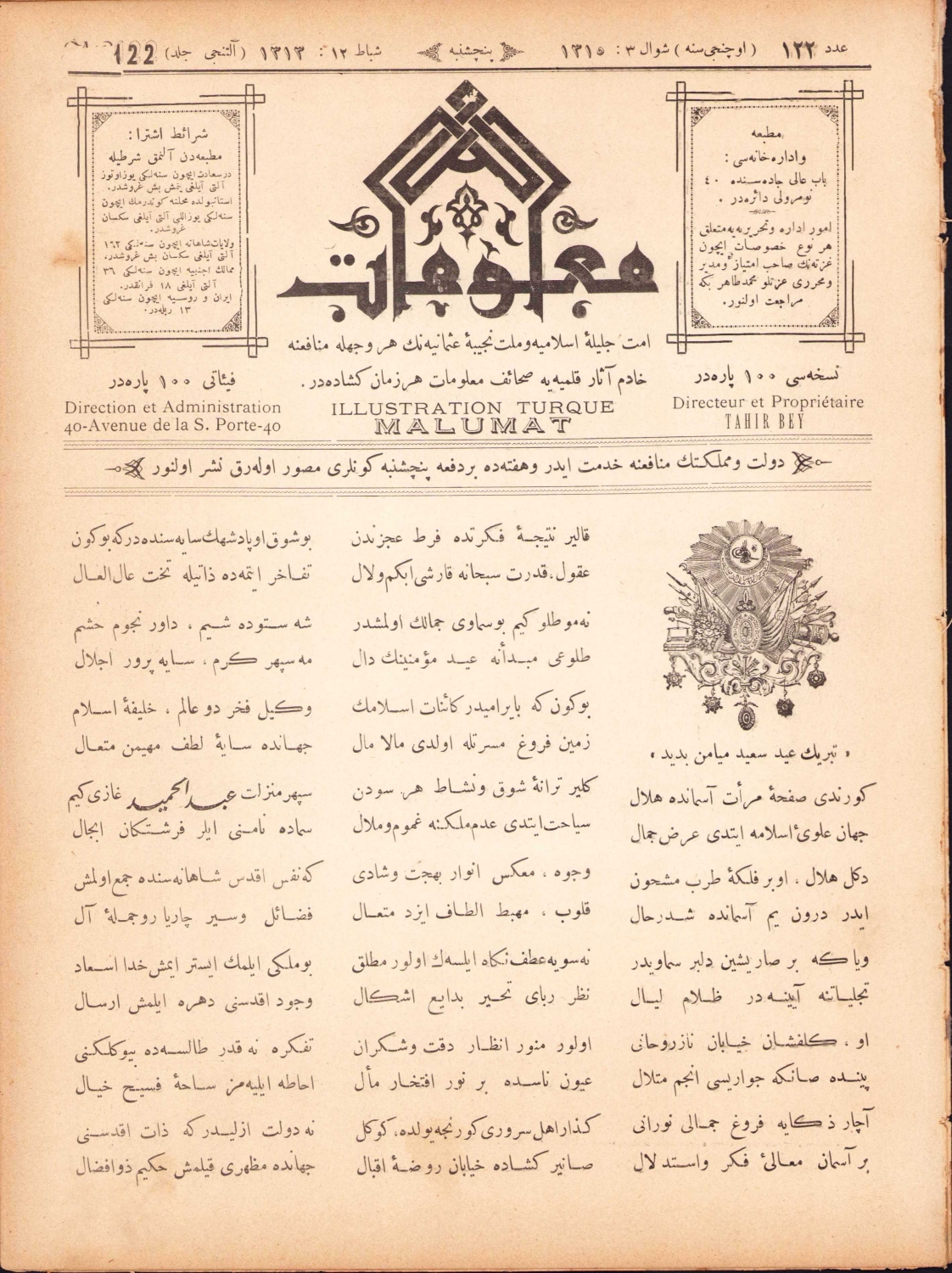 Osmanlıca hicri 1315 tarihli "Malumat" mecmuası, resimli, dergi ortadan ayrılmış, 15 sayfa, 23x33 cm