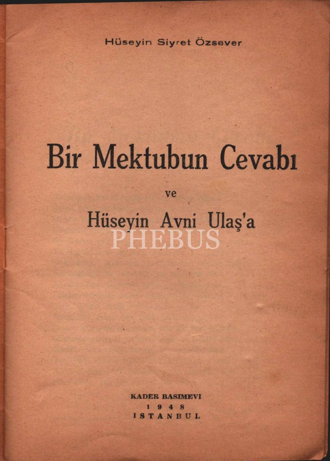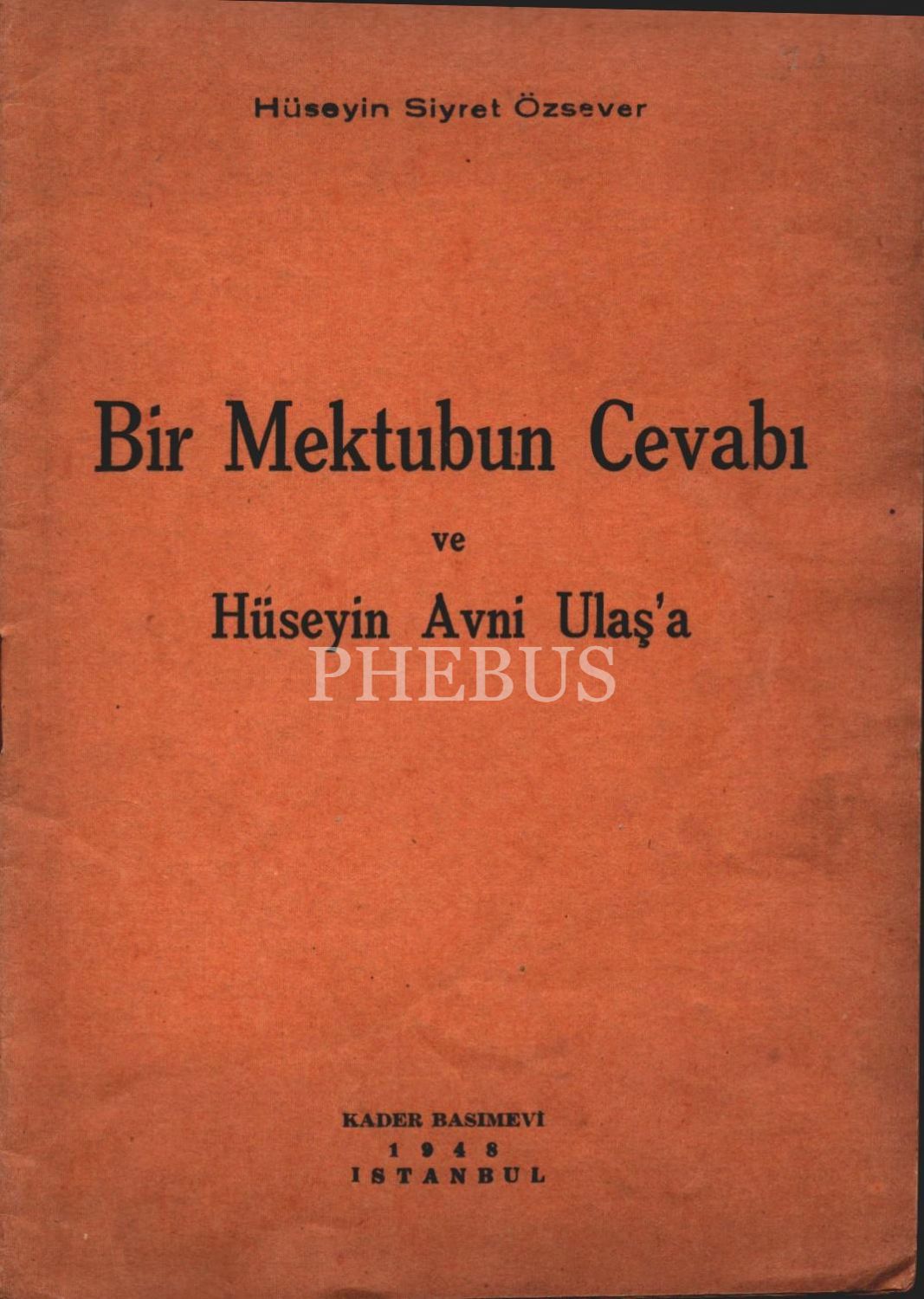 BİR MEKTUBUN CEVABI VE HÜSEYİN AVNİ ULAŞ´A, Hüseyin Siyret Özsever, Kader Basımevi, İstanbul 1948, 14 sayfa, 14x20 cm