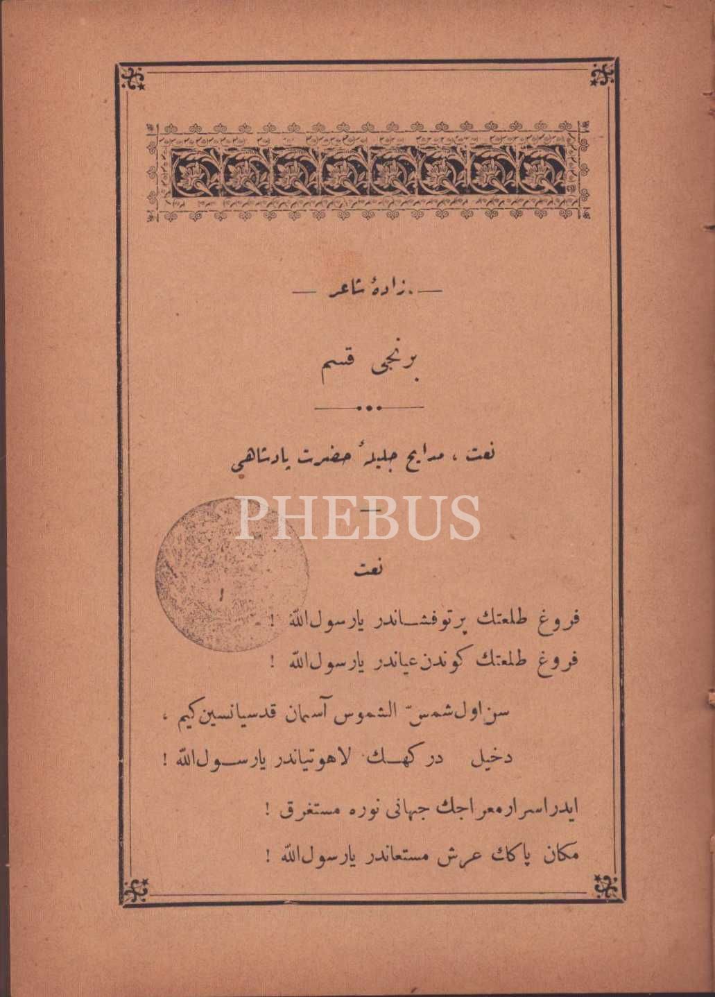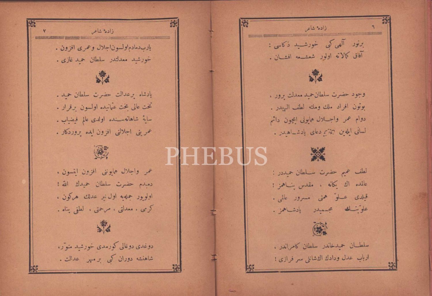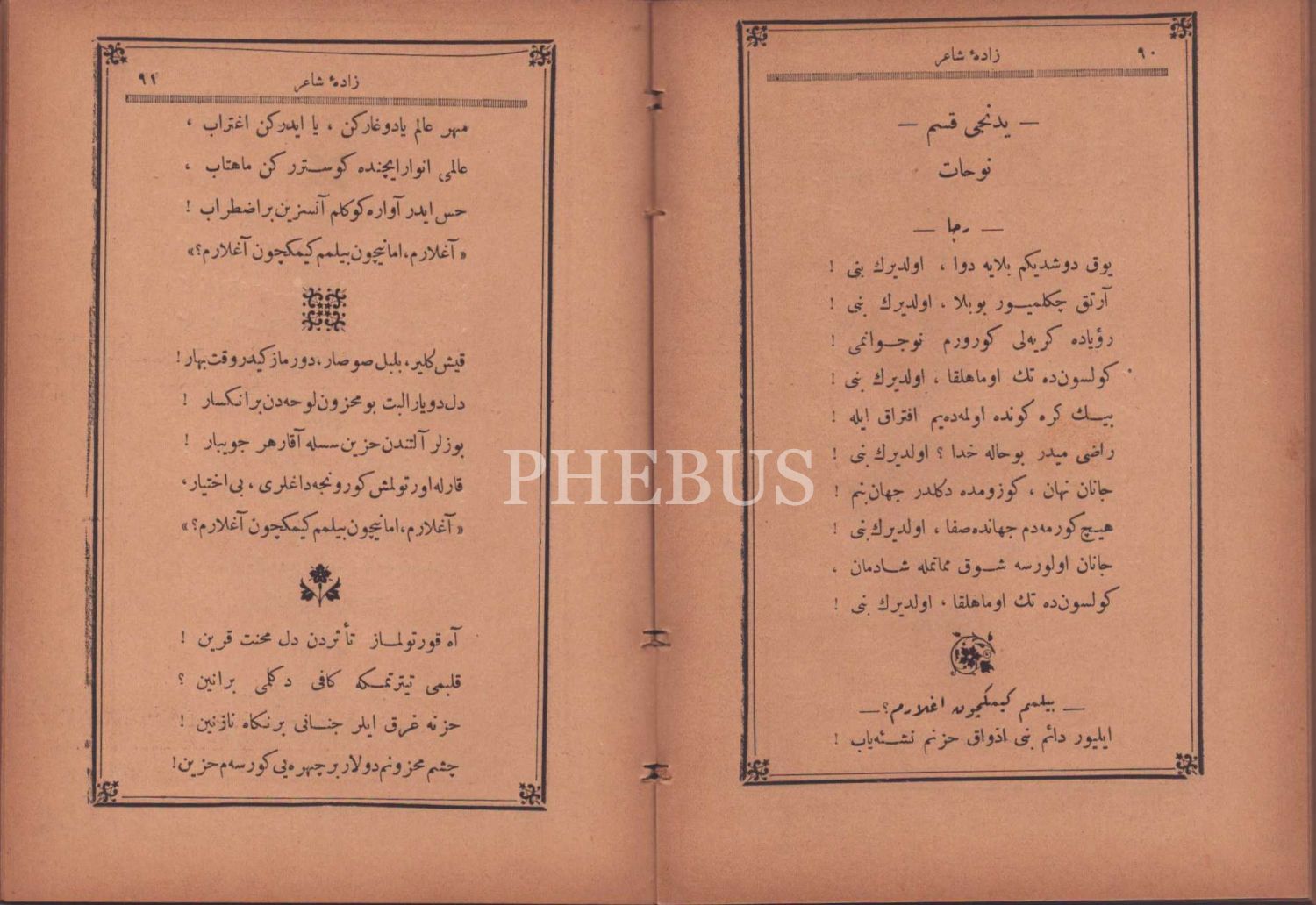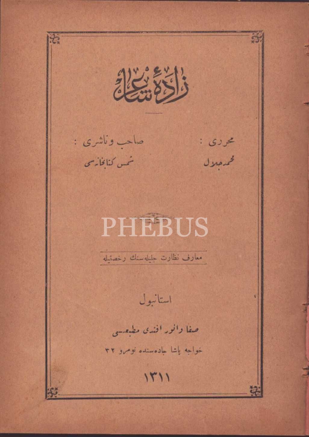 Mükâfat cildinde ZÂDE-İ ŞÂİR, Mehmed Celal, Safa ve Enver Efendi Matbaası, İstanbul 1311, 142 s., 14x19 cm