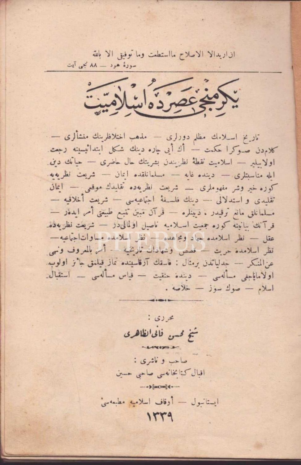 YİRMİNCİ ASIRDA İSLÂMİYYET, Şeyh Muhsin Fâni ez-Zâhirî, İkbal Kitabhanesi, İstanbul 1339, 260 s., 14x20 cm