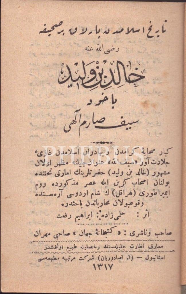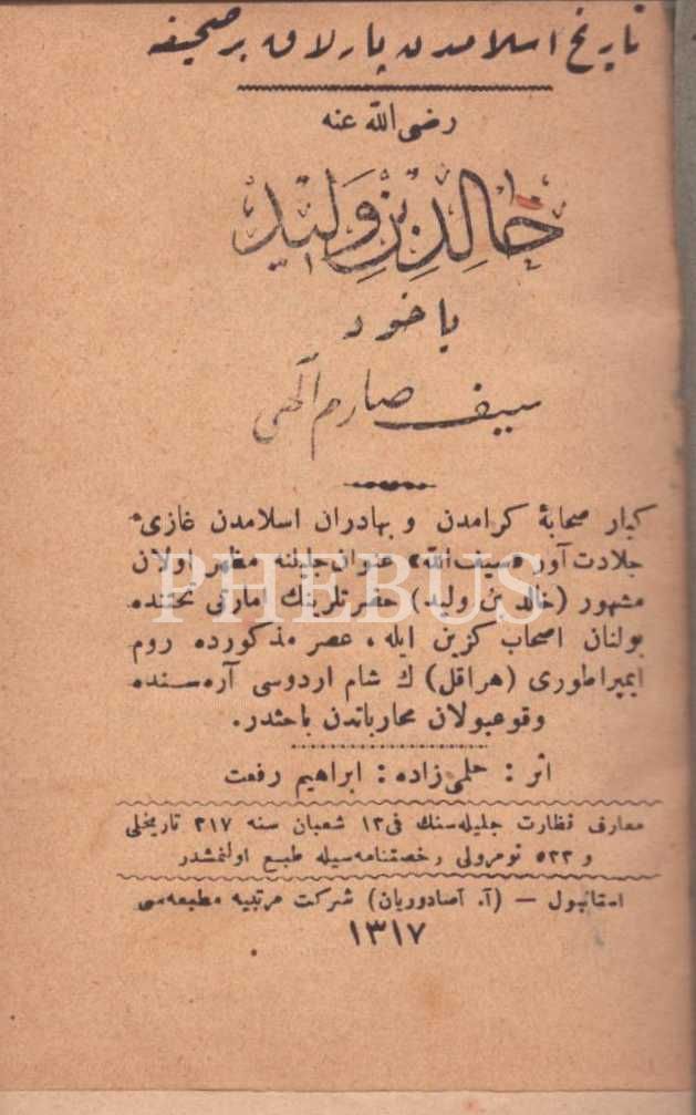 HÂLİD BİN VELÎD YÂHÛD SEYF-İ SÂRİM-İ İLÂHÎ, Hilmizâde İbrahim Rifat, A. Asaduryan Şirket-i Mürettibiye Matbaası, İstanbul 1317, 334 s., 10x14 cm