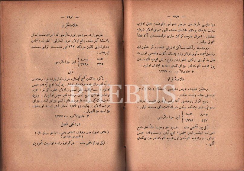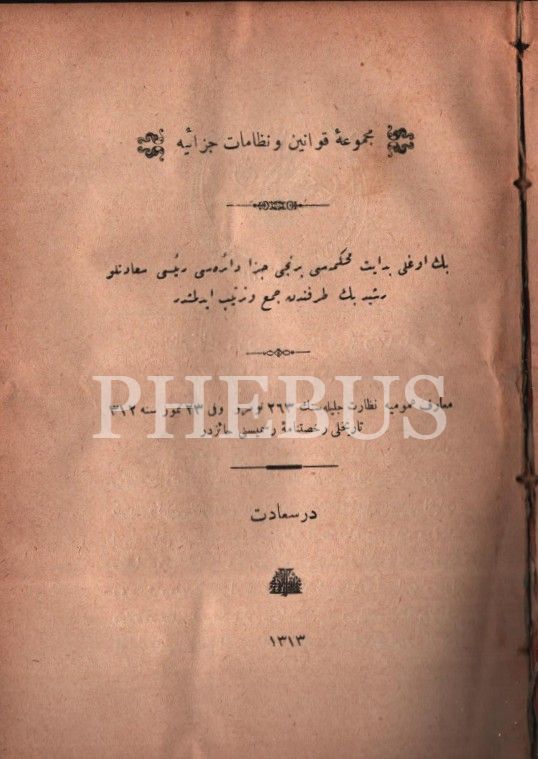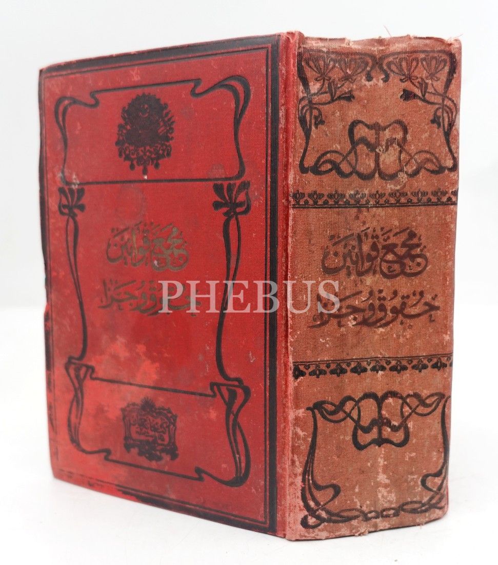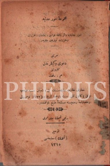 Osmanlı armalı cildinde 2 eser bir arada: MECMÛA-İ UMÛR-I ADLİYYE (1. Kısım 1. Cilt), derl. Gelibolulu M. Rifat, Ahenk Matbaası, İzmir 1315, 729 s.; MECMÛA-İ KAVÂNÎN VE NİZÂMÂT-I CEZÂİYYE, İstanbul 1313, 589 s., 15x20 cm