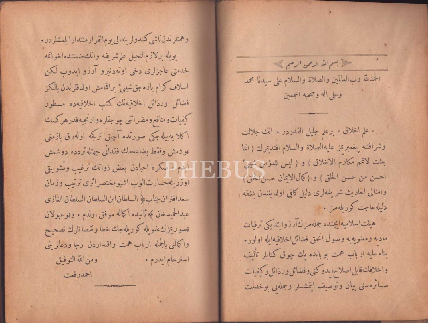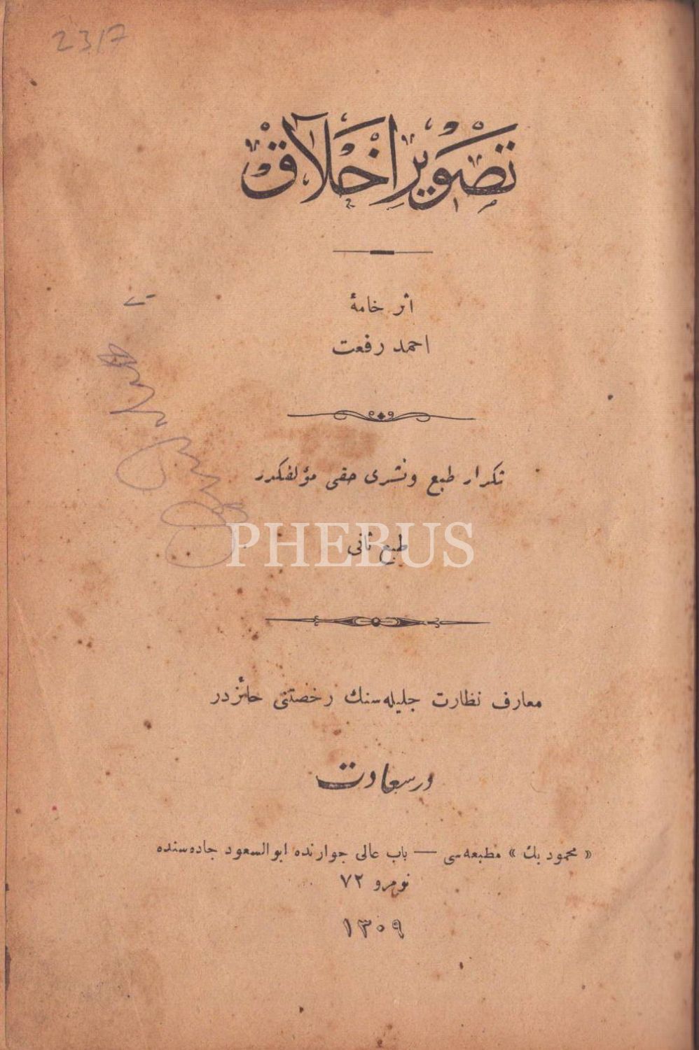 Tuğralı ve ay yıldızlı cildinde 2 eser bir arada: TASVÎR-İ AHLÂK, Ahmed Rifat, Mahmud Bey Matbaası, İstanbul 1309, 344 s.; İNŞÂ MUALLİMİ, Mustafa Reşid, Enver Efendi Matbaası, İstanbul 1310, 292 s., 15x20 cm