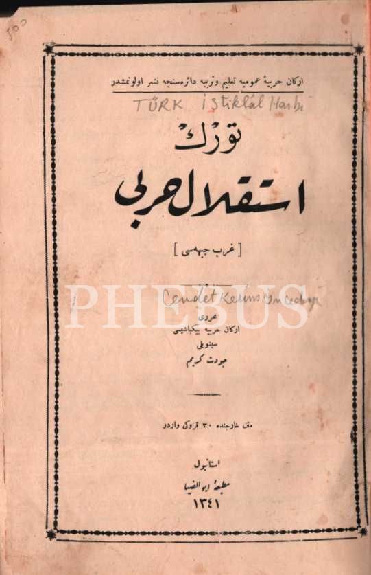 TÜRK İSTİKLÂL HARBİ (Garb Cebhesi), Cevdet Kerim, Ebuzziya Matbaası, İstanbul 1341, 222 s., 19x25 cm