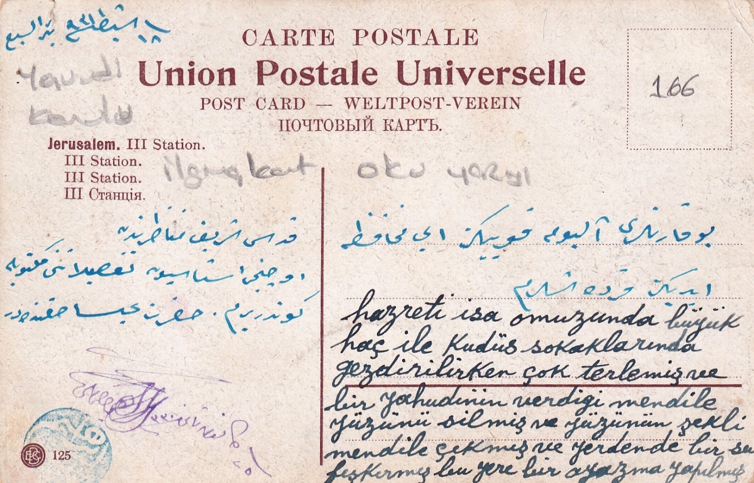 Osmanlıca "bu kartları albüme koyunuz ve muahafaza ediniz kardeşlerim. Kudüs şerif manzaralarından, üçüncü istasyon tasilat mektubu gönderiyorum. Hz İsa hakkında" yazılı 1921 tarihli