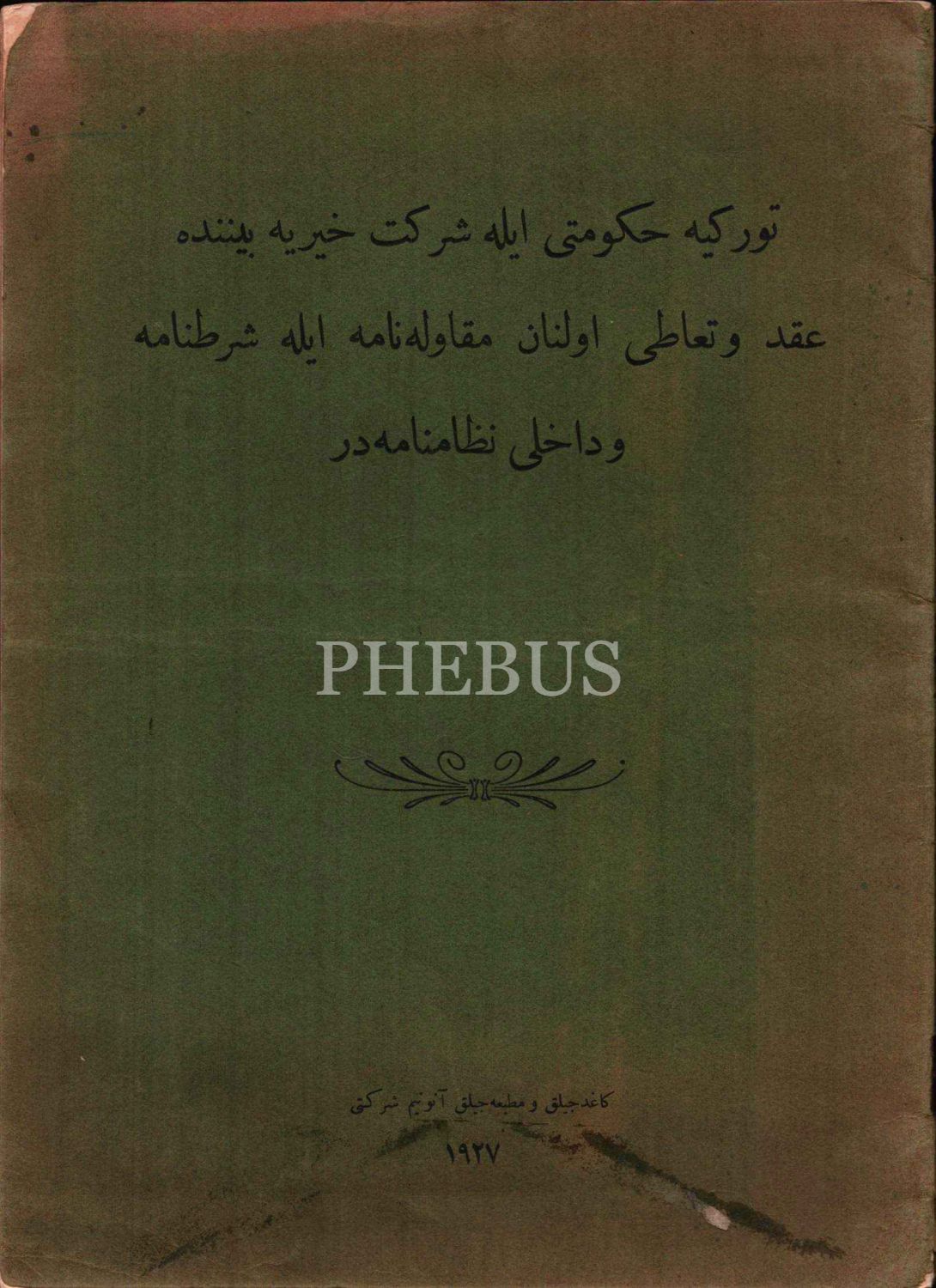 TÜRKİYE HÜKÛMETİ İLE ŞİRKET-İ HAYRİYYE BEYNİNDE AKD VE TEÂTÎ OLUNAN MUKÂVELENÂME İLE ŞARTNÂME VE DÂHİLÎ NİZÂMNÂME, Kâğıdcılık ve Matbaacılık A. Ş., 1927, 38 s., 20x28 cm