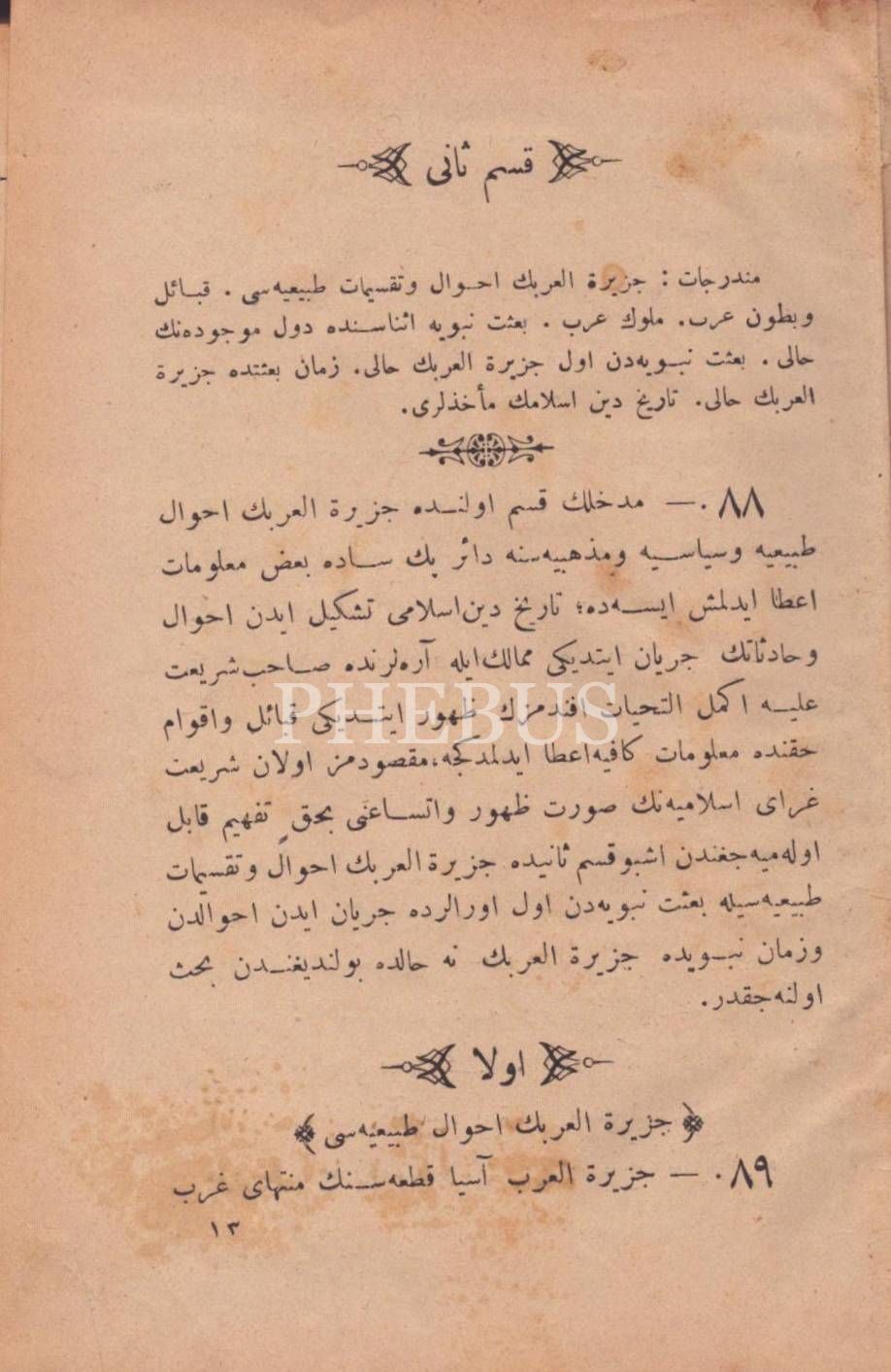 Osmanlı armalı ve hilalli cildinde TÂRÎH-İ DÎN-İ İSLÂM- MEDHAL (2. Kısım), 193 ila 366. sayfalar, 13x20 cm