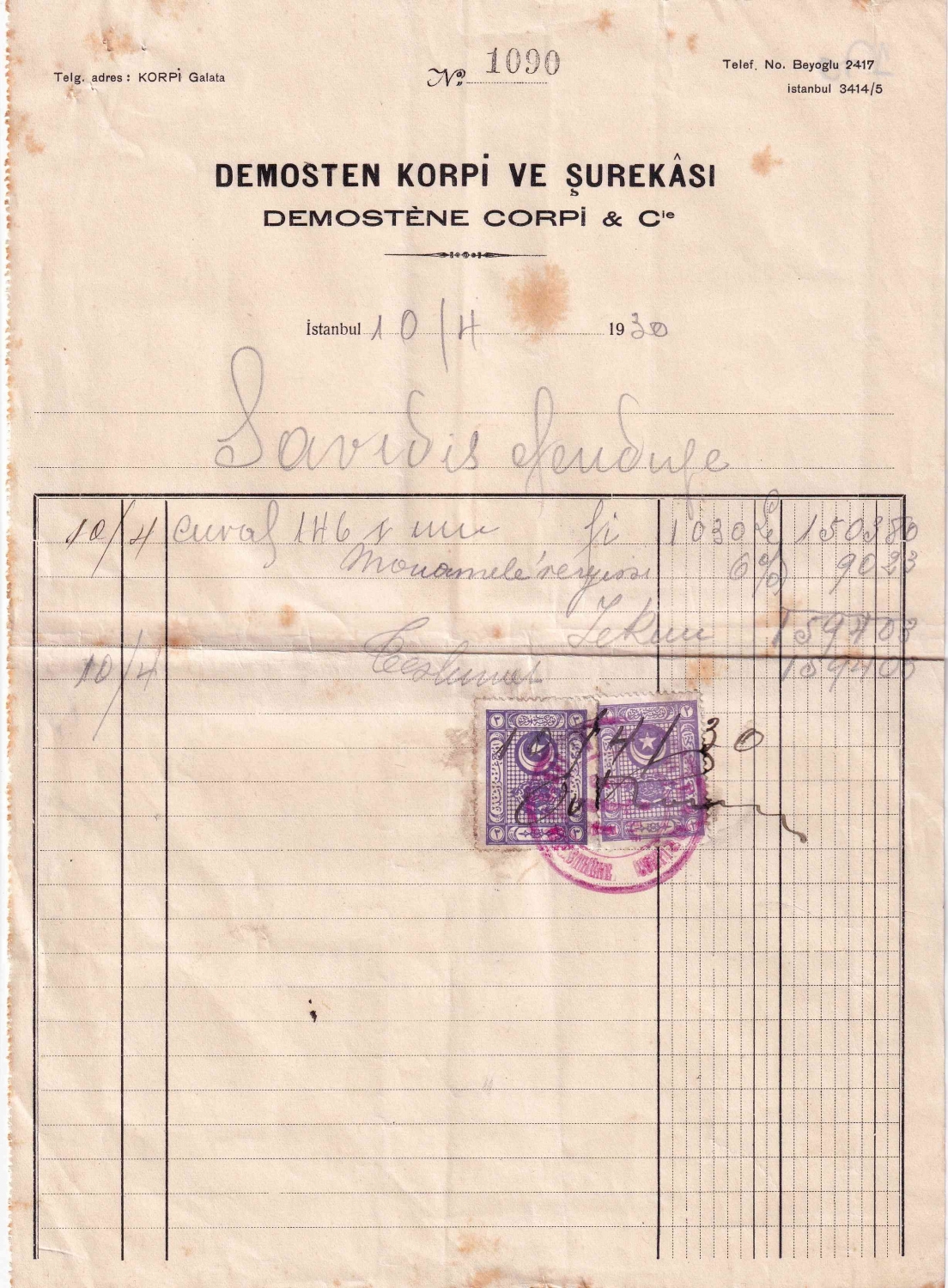 Demosten Korpi ve Şurekası antetli, 1930 tarihli fatura
