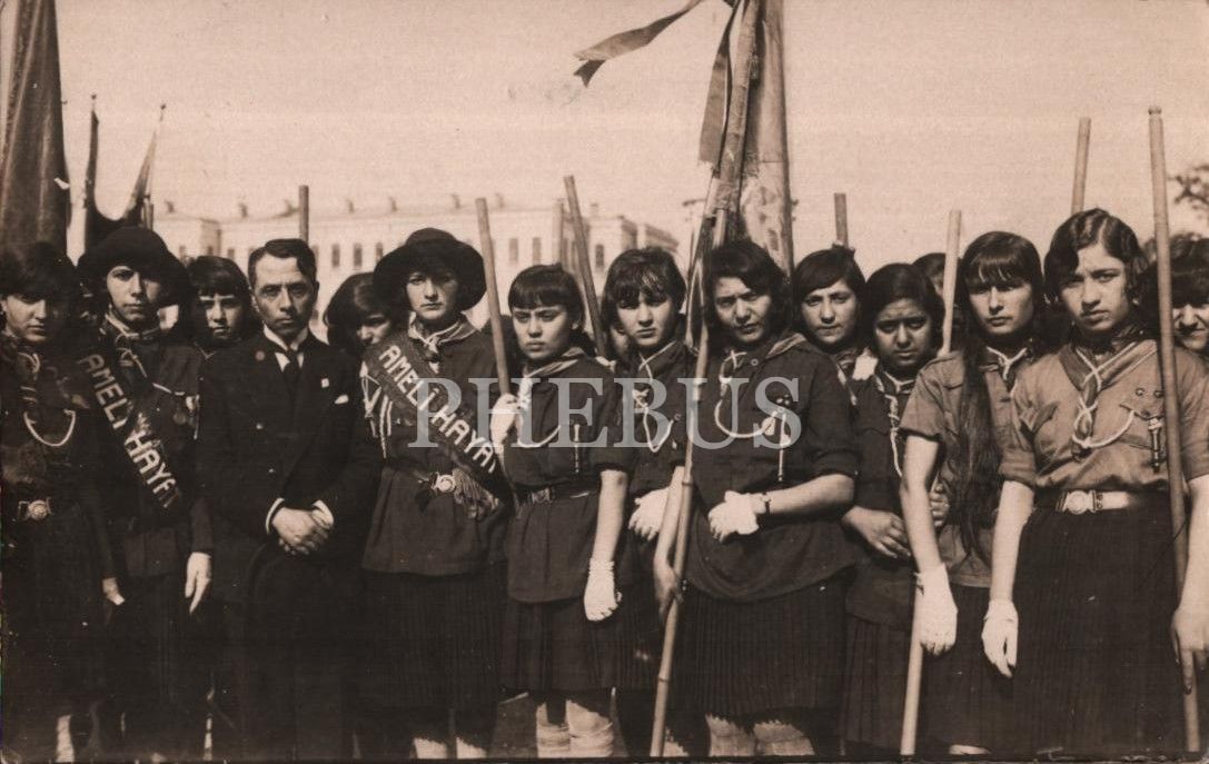 Bir millî bayram töreni öncesi öğretmenleriyle hatıra fotoğrafı çektiren Amelî Hayat Mektebi izcileri, 14x9 cm