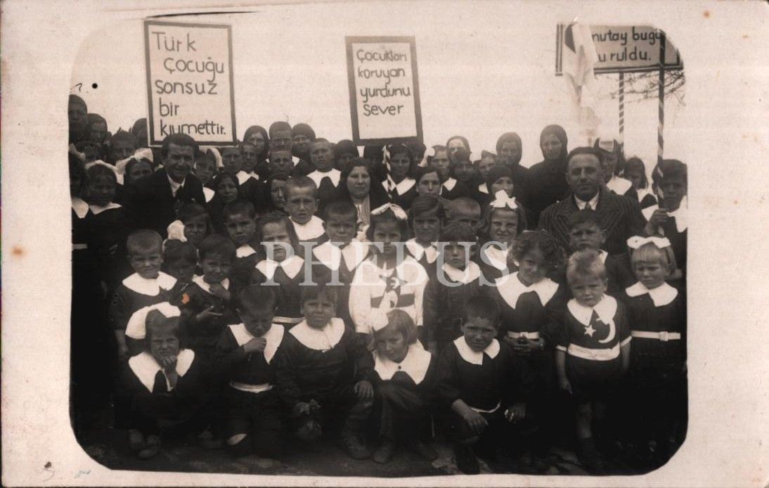 "Türk Çocuğu Sonsuz Bir Kıymettir" ve "Çocukları Koruyan Yurdunu Sever" yazılı pankartlarla 23 Nisan Ulusal Egemenlik ve Çocuk Bayramı´nı kutlayan küçük öğrenciler ile öğretmenleri, 14x9 cm