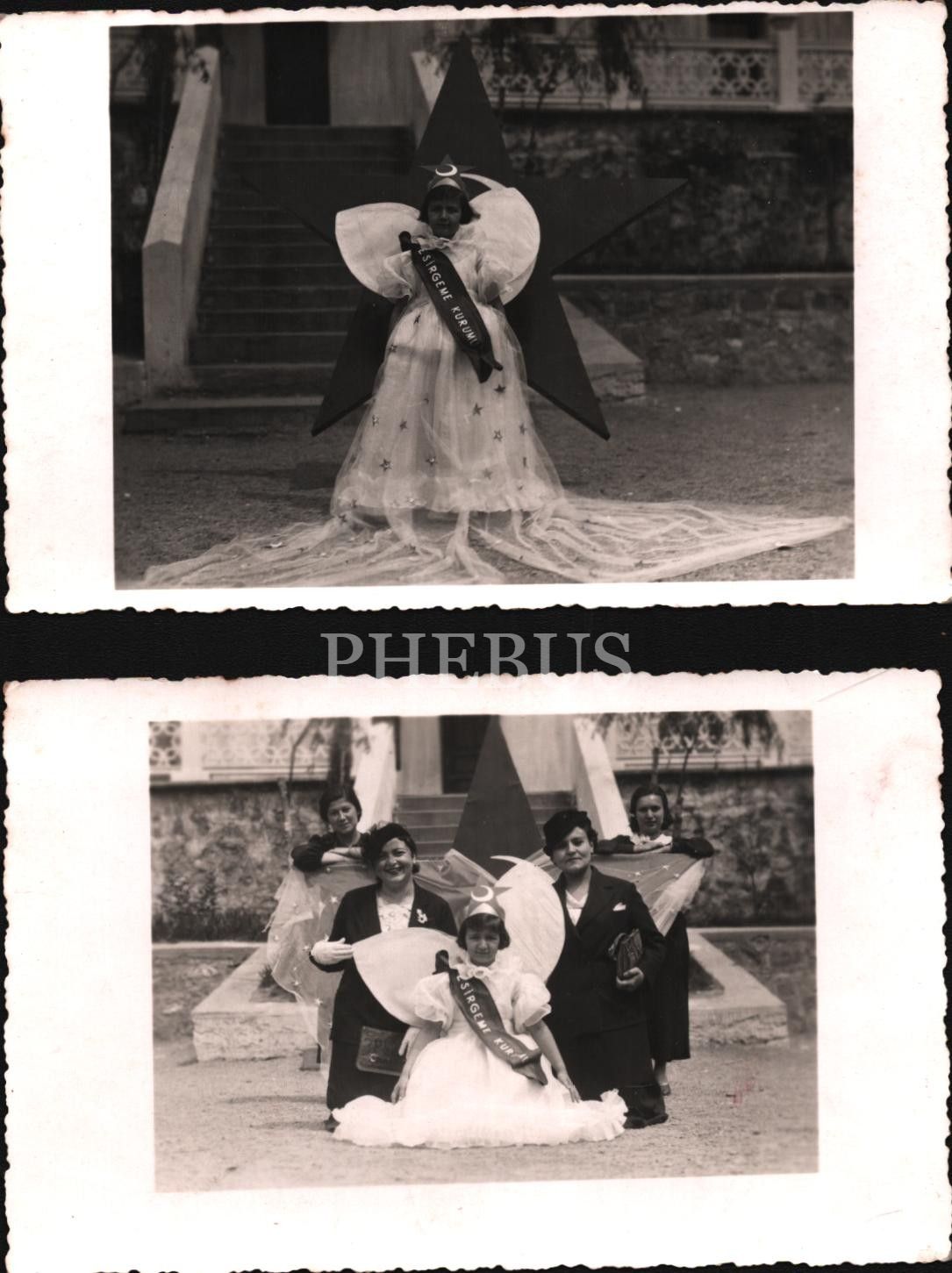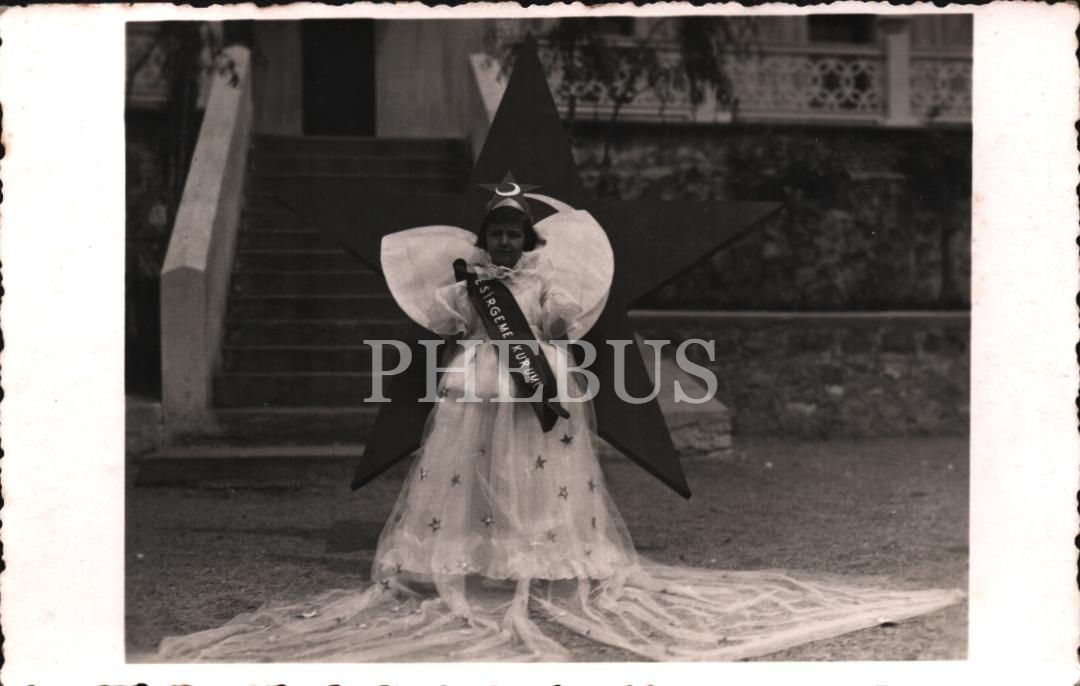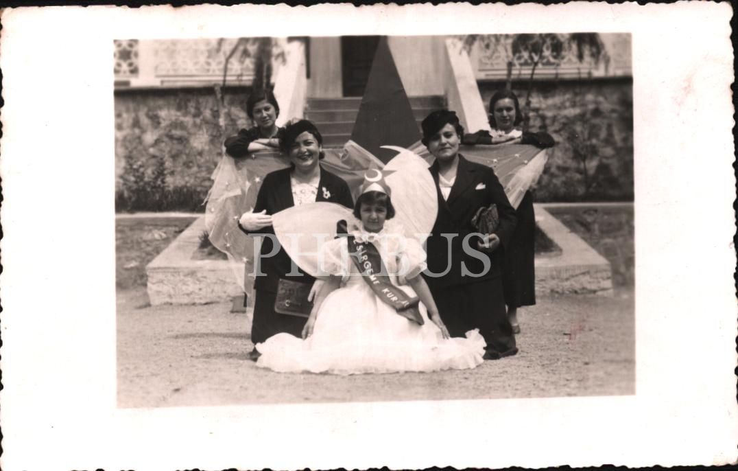 Ay yıldızlı elbisesinin üzerine "Esirgeme Kurumu" yazılı kuşak takan küçük kız çocuğunun iki adet fotoğrafı, Zonguldak, 14x9 cm