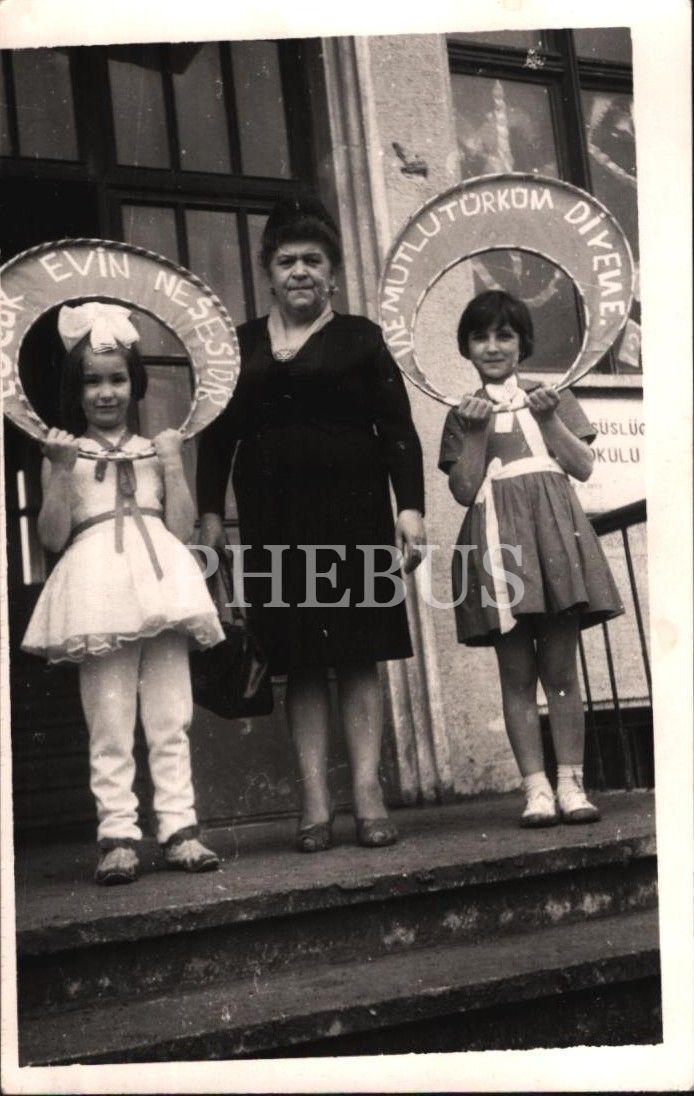 Ellerinde "Çocuk Evin Neşesidir" ve "Ne Mutlu Türküm Diyene" yazılı hilaller tutan küçük kız öğrenciler ile öğretmenleri, 9x14 cm