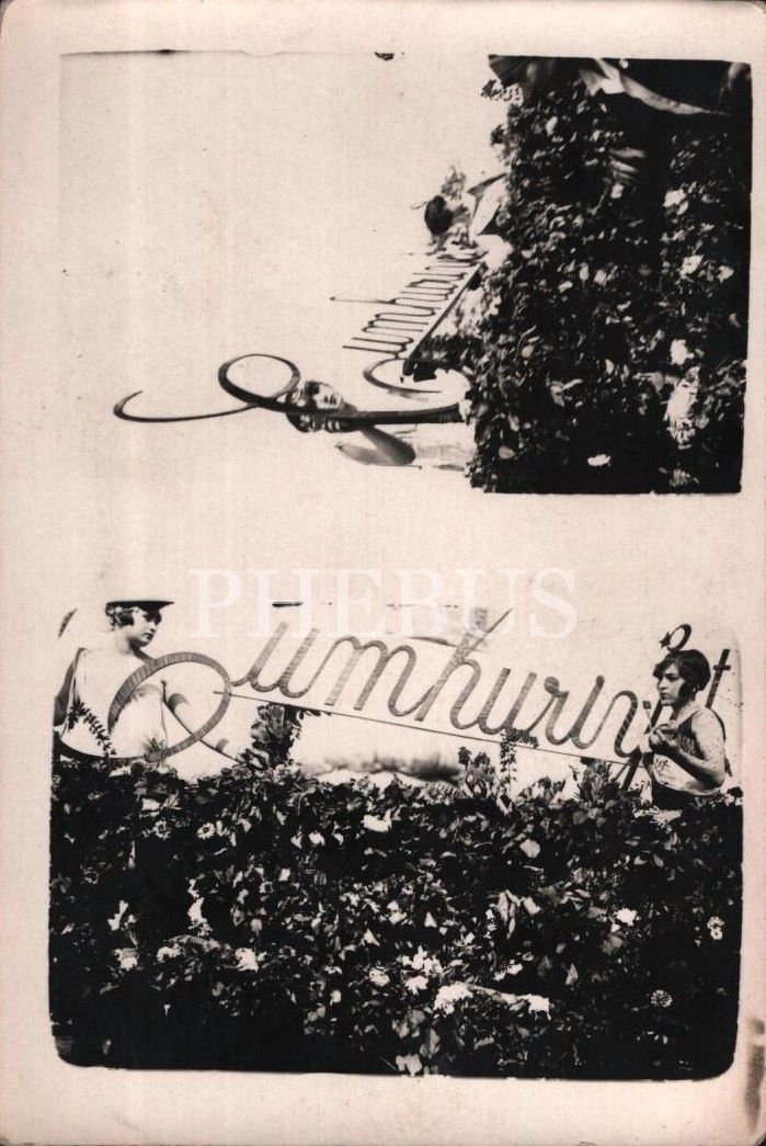 Çiçeklerle süslenmiş bir otomobilin üzerinde "Cumhuriyet" yazılı levhayı taşıyan genç kızların parçalı fotoğrafı, 14x9 cm