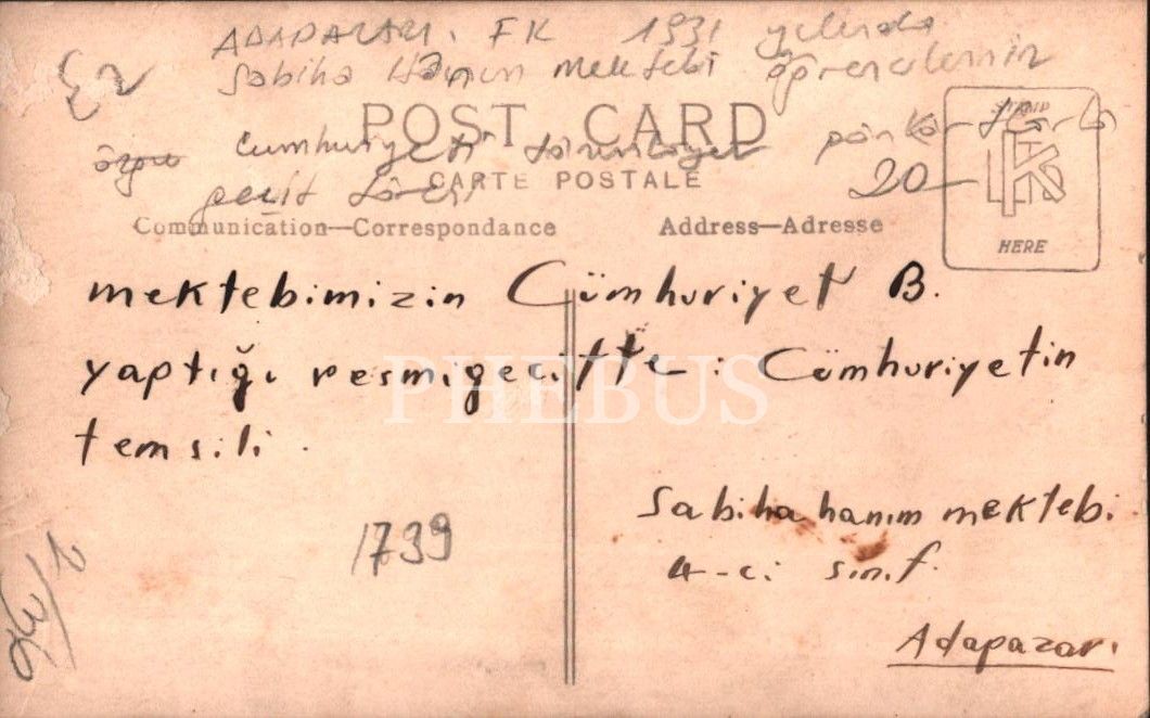 "Mektebimizin Cümhuriyet B. yaptığı resmi geçitte: Cümhuriyetin temsili. Sabiha Hanım Mektebi 4-ci sınıf. Adapazarı"