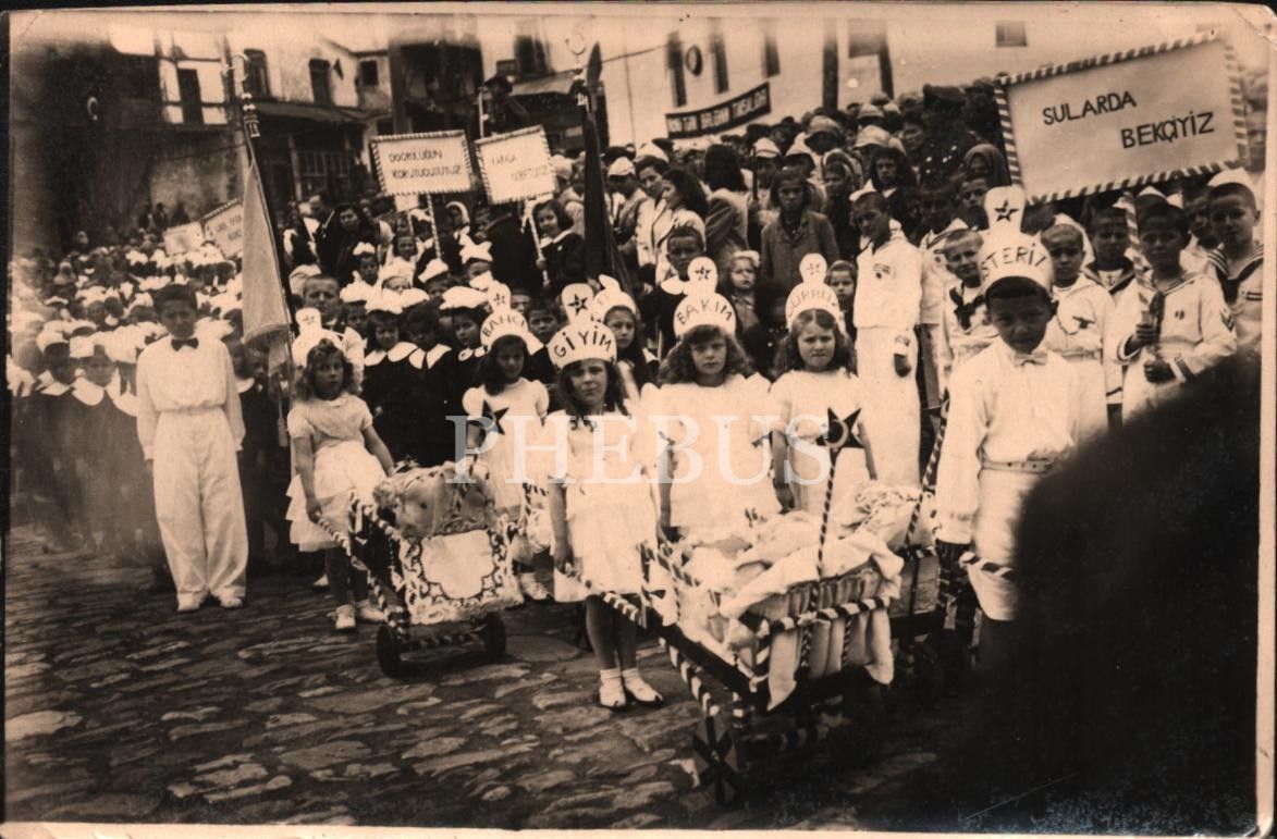 "Doğruluğun Koruyucusuyuz", "Karada Nöbetçiyiz", "Sularda Bekçiyiz" yazılı pankartların seçildiği bir millî bayram günü hatırası, 15x10 cm