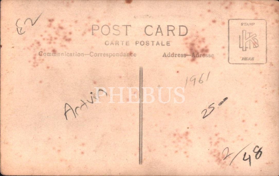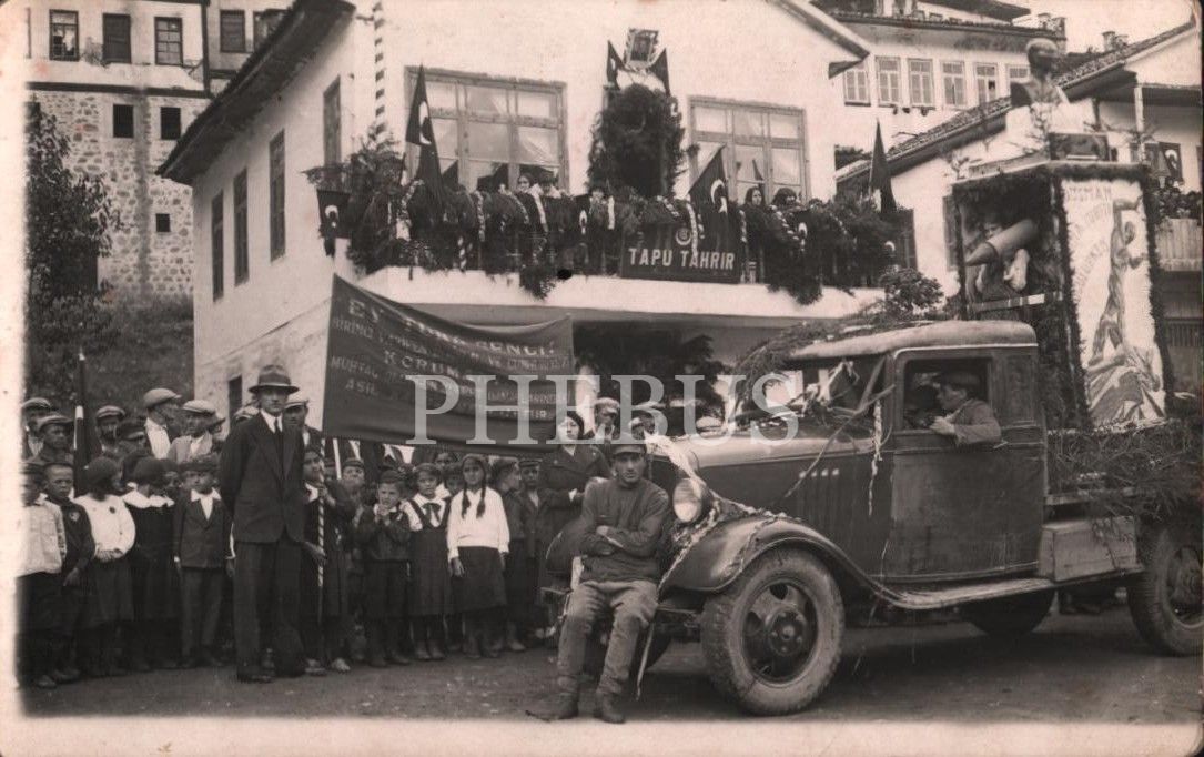 "Tapu Tahrir" binası önünde Atatürk´ün Gençliğe Hitabesi´nin ilk ve son cümlelerinin yazılı olduğu pankartı tutan öğrencilerin ve süslenmiş bir kamyonetin görüldüğü millî bayram enstantanesi, Artvin, 14x9 cm