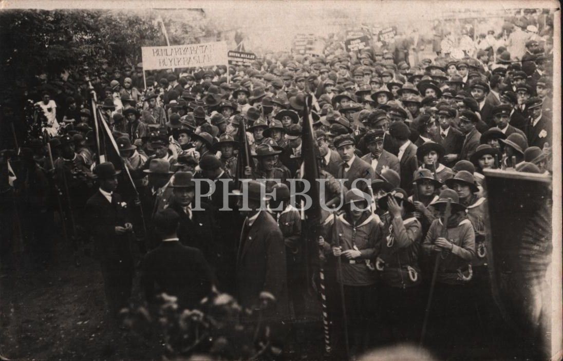 Edirne´nin Kurtuluşu kutlamalarına katılan izci üniformalı ve okul şapkalı gençler, arkada "Bunları Yaratan Büyük Başlar" yazılı bir pankart görülmekte, 14x9 cm