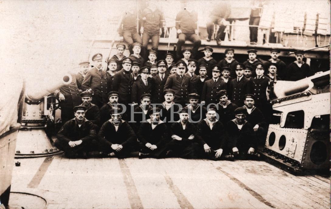 Osmanlıca yazılı şapkaları görülen bahriyeli er ve subayların gemi güvertesinde çekilmiş toplu hatıra fotoğrafı, 14x9 cm