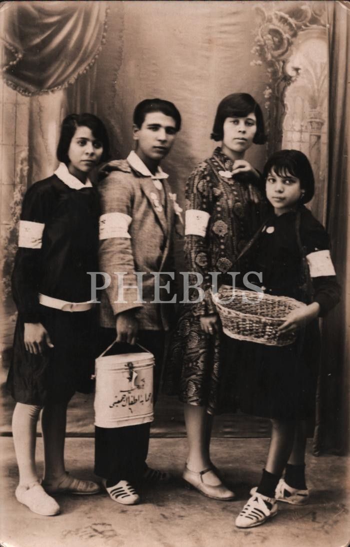 Elinde Osmanlıca "Himaye-i Etfal Cemiyeti" yazılı teberrü [bağış] kutusunun görüldüğü bir genç ile kardeşlerinin stüdyo hatıra fotoğrafı, 9x14 cm
