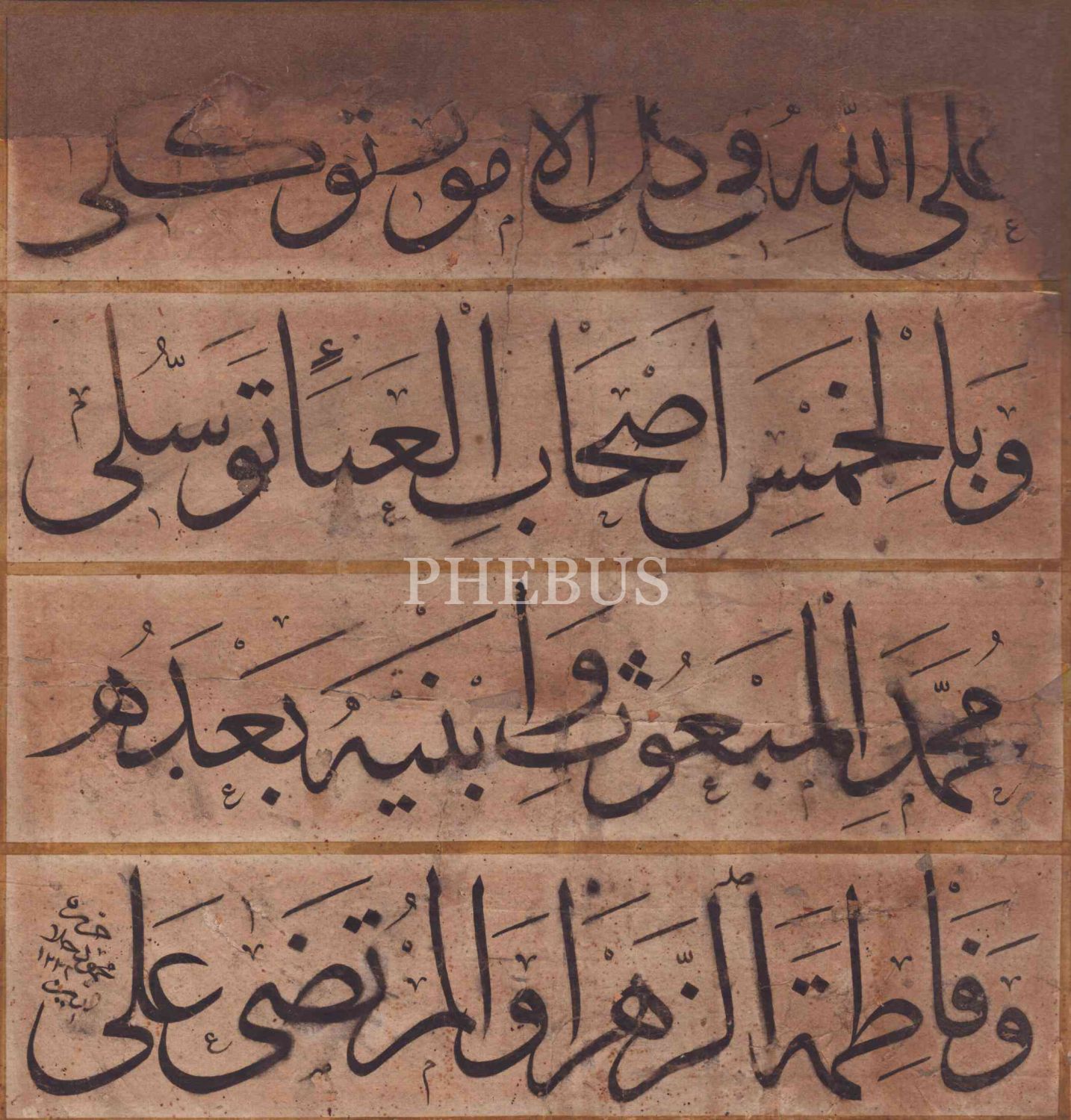 Kasidenin okunuşu: "Ale´llâhi fî külli´l-umûri tevekkülî; ve Bi´l-hamsi ashâbi´l-abâi tevessülî; Muhammedi´l-meb´ûsi ve´bneyhi ba´dehû; ve Fâtımatü´z-Zehrâ ve´l-Murtezâ Alî [Her işimde Allah'a tevekkül ederim; Şu beş kişiyi vesile bellerim; Resul Muhammed'le iki gözbebeği; Fatıma-i Zehra ve Murteza Ali]"