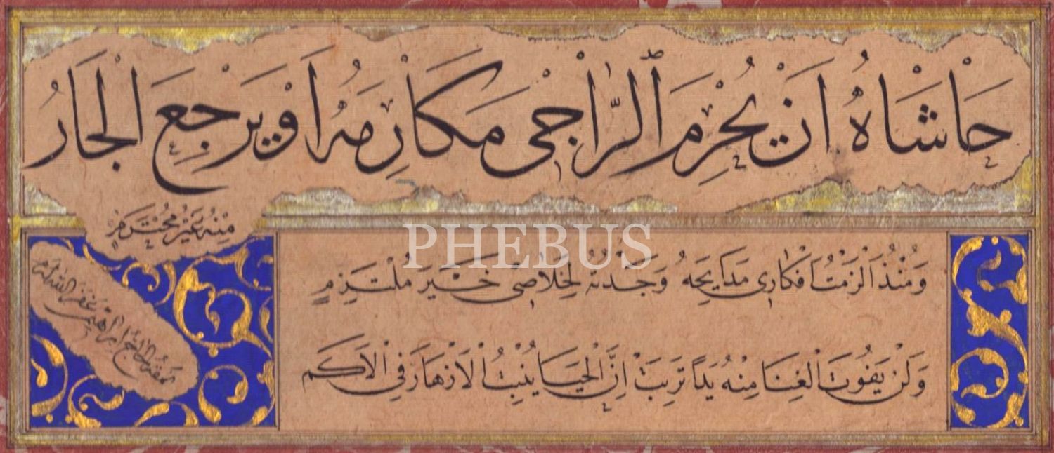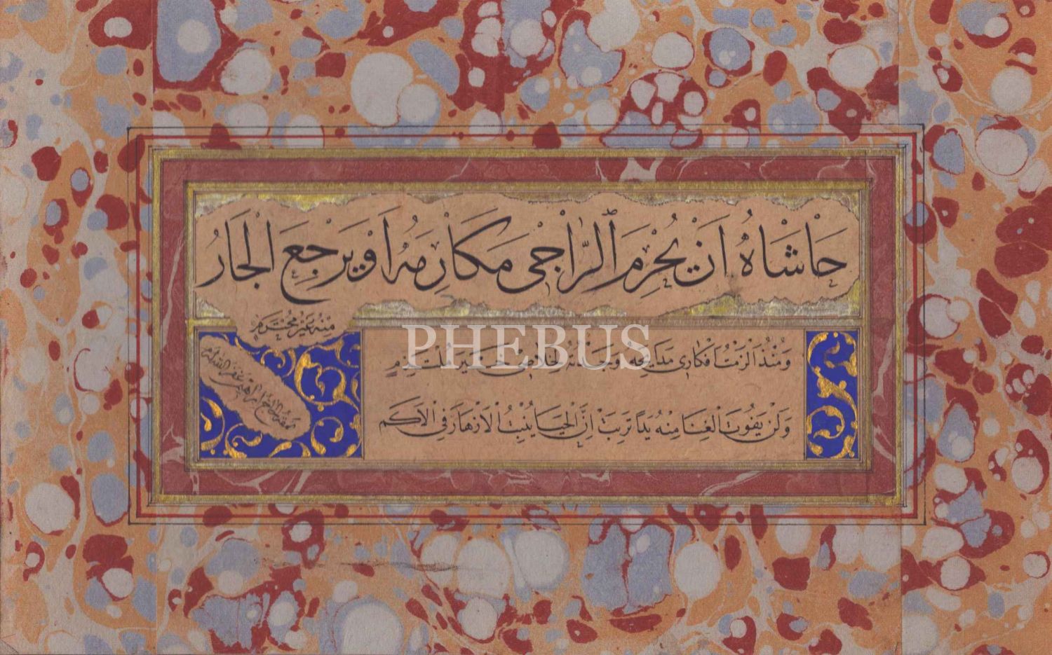 el-Hac İbrahim hattıyla sülüs-nesih Kasîde-i Bürde beyitleri, ebru pervazlı, 19x30 cm